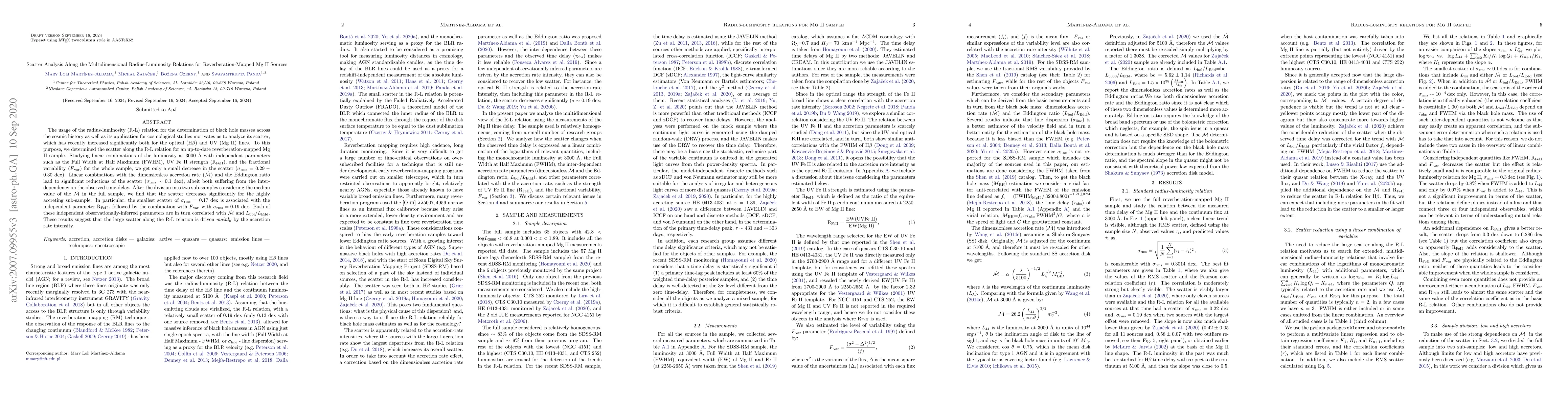 The usage of the radius-luminosity (R-L) relation for the determination of black hole masses across the cosmic history as well as its application for cosmological studies motivates us to analyze its scatter, which has recently increased significantly both for the optical (H$\beta$) and UV (Mg II) lines. To this purpose, we determined the scatter along the R-L relation for an up-to-date reverberation-mapped Mg II sample. Studying linear combinations of the luminosity at 3000 A with independent parameters such as the Full Width at Half Maximum (FWHM), Fe II strength (R$_\mathrm{FeII}$), and the fractional variability ($F\mathrm{_{var}}$) for the whole sample, we get only a small decrease in the scatter ($\sigma{_{\rm rms}}=0.29-0.30$ dex). Linear combinations with the dimensionless accretion rate ($\dot{\mathcal{M}}$) and the Eddington ratio ($\alpha_\mathrm{Edd}$) lead to significant reductions of the scatter ($\sigma_{\rm rms}\sim 0.1$ dex), albeit both suffering from the inter-dependency on the observed time-delay. After the division into two sub-samples considering the median value of the $\dot{\mathcal{M}}$ in the full sample, we find that the scatter decreases significantly for the highly accreting sub-sample. In particular, the smallest scatter of $\sigma{_{\rm rms}}=0.17$ dex is associated with the independent parameter R$_\mathrm{FeII}$, followed by the combination with $F\mathrm{_{var}}$, with $\sigma{_{\rm rms}}=0.19$ dex. Both of these independent observationally-inferred parameters are in turn correlated with $\dot{\mathcal{M}}$ and $\alpha_\mathrm{Edd}$. These results suggest that the large scatter along the R-L relation is driven $\textit{mainly}$ by the accretion rate intensity.