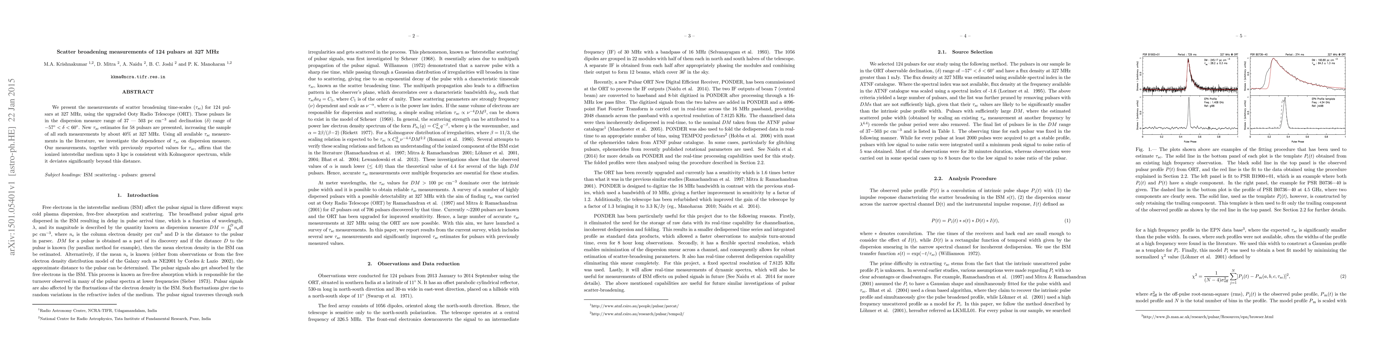 This study measures scatter broadening time-scales for 124 pulsars at 327 MHz using the Ooty Radio Telescope, presenting new estimates for 58 pulsars. The findings support the Kolmogorov spectrum for the ionized interstellar medium up to 3 kpc, with significant deviations beyond this distance.