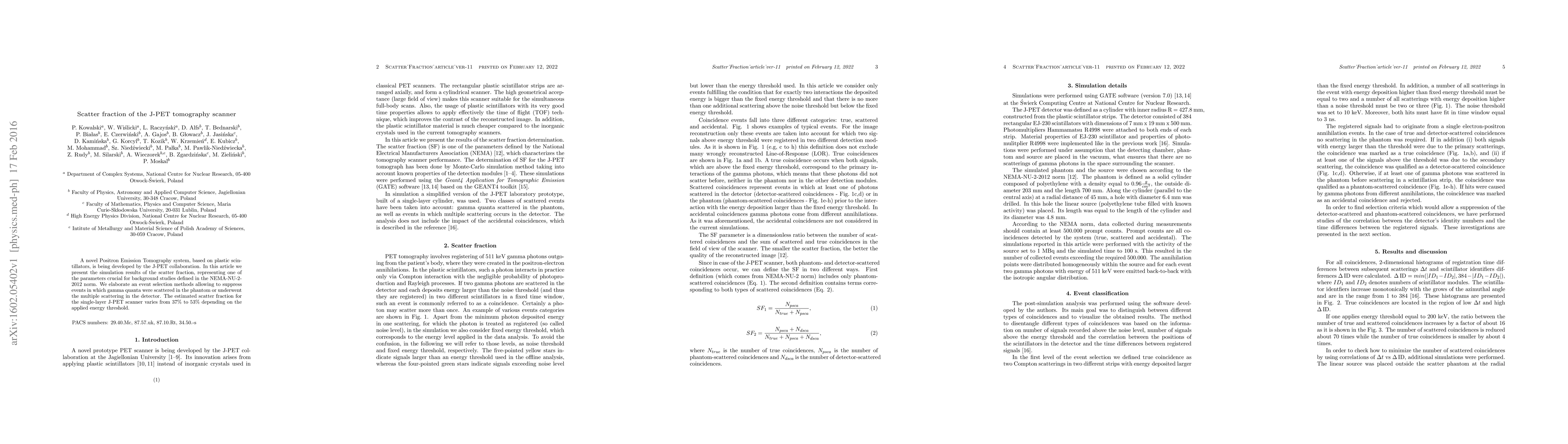 The J-PET collaboration's new Positron Emission Tomography scanner has a scatter fraction of 37-53%, affecting its accuracy, and methods have been developed to minimize this impact.