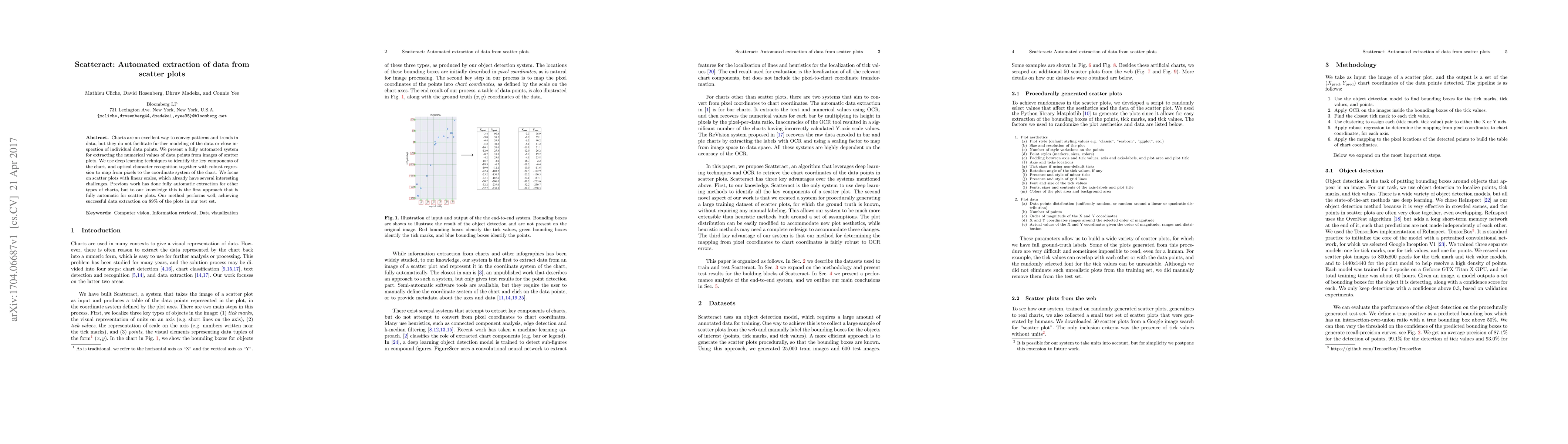 The paper introduces Scatteract, an automated system using deep learning and optical character recognition to extract numerical data from scatter plots, enabling further data modeling. The method achieves successful extraction in 89% of tested plots, marking the first fully automatic approach for scatter plots.