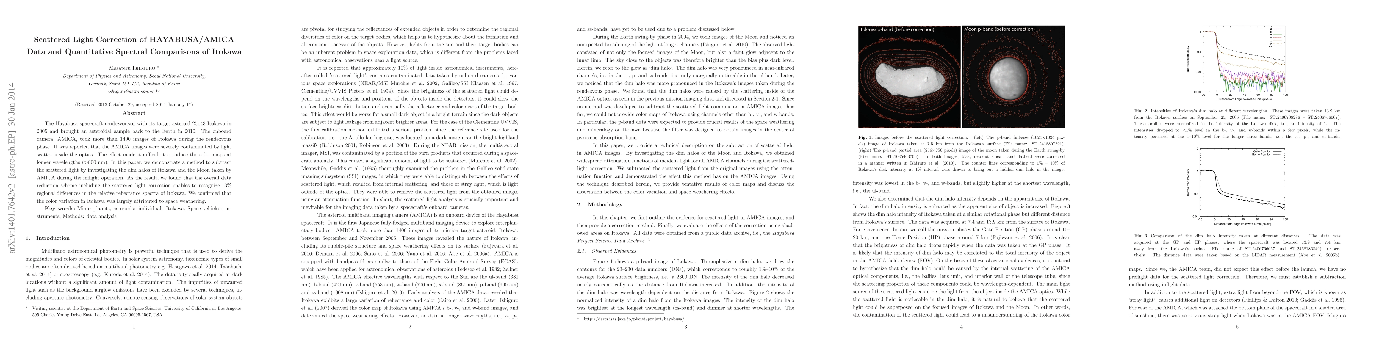 This paper presents a method to correct scattered light in AMICA images from the Hayabusa spacecraft, enabling a ~3% recognition of regional reflectance differences on asteroid Itokawa. The correction revealed that the color variations are primarily due to space weathering effects.
