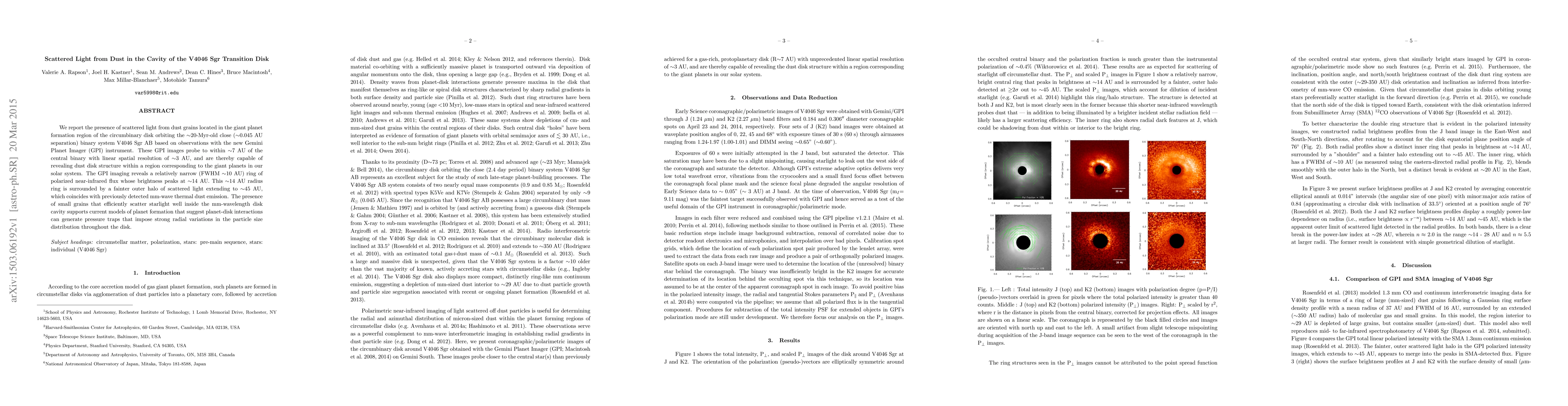 We report the presence of scattered light from dust grains located in the giant planet formation region of the circumbinary disk orbiting the ~20-Myr-old close (~0.045 AU separation) binary system V4046 Sgr AB based on observations with the new Gemini Planet Imager (GPI) instrument. These GPI images probe to within ~7 AU of the central binary with linear spatial resolution of ~3 AU, and are thereby capable of revealing dust disk structure within a region corresponding to the giant planets in our solar system. The GPI imaging reveals a relatively narrow (FWHM ~10 AU) ring of polarized near-infrared flux whose brightness peaks at ~14 AU. This ~14 AU radius ring is surrounded by a fainter outer halo of scattered light extending to ~45 AU, which coincides with previously detected mm-wave thermal dust emission. The presence of small grains that efficiently scatter starlight well inside the mm-wavelength disk cavity supports current models of planet formation that suggest planet-disk interactions can generate pressure traps that impose strong radial variations in the particle size distribution throughout the disk.
