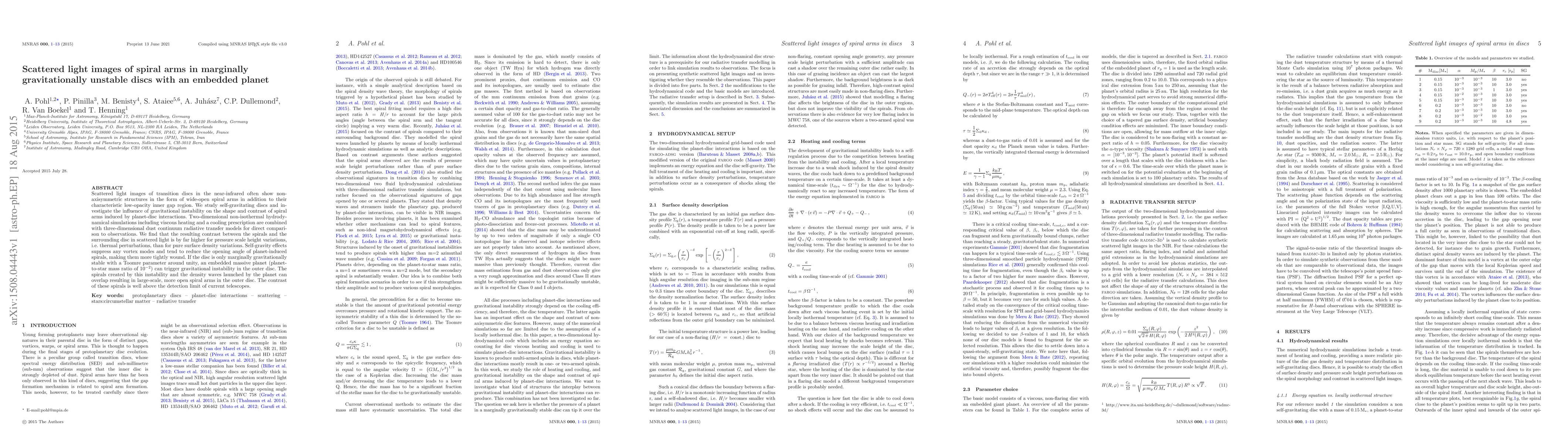 Scattered light images of transition discs in the near-infrared often show non-axisymmetric structures in the form of wide-open spiral arms in addition to their characteristic low-opacity inner gap region. We study self-gravitating discs and investigate the influence of gravitational instability on the shape and contrast of spiral arms induced by planet-disc interactions. Two-dimensional non-isothermal hydrodynamical simulations including viscous heating and a cooling prescription are combined with three-dimensional dust continuum radiative transfer models for direct comparison to observations. We find that the resulting contrast between the spirals and the surrounding disc in scattered light is by far higher for pressure scale height variations, i.e. thermal perturbations, than for pure surface density variations. Self-gravity effects suppress any vortex modes and tend to reduce the opening angle of planet-induced spirals, making them more tightly wound. If the disc is only marginally gravitationally stable with a Toomre parameter around unity, an embedded massive planet (planet-to-star mass ratio of $10^{-2}$) can trigger gravitational instability in the outer disc. The spirals created by this instability and the density waves launched by the planet can overlap resulting in large-scale, more open spiral arms in the outer disc. The contrast of these spirals is well above the detection limit of current telescopes.