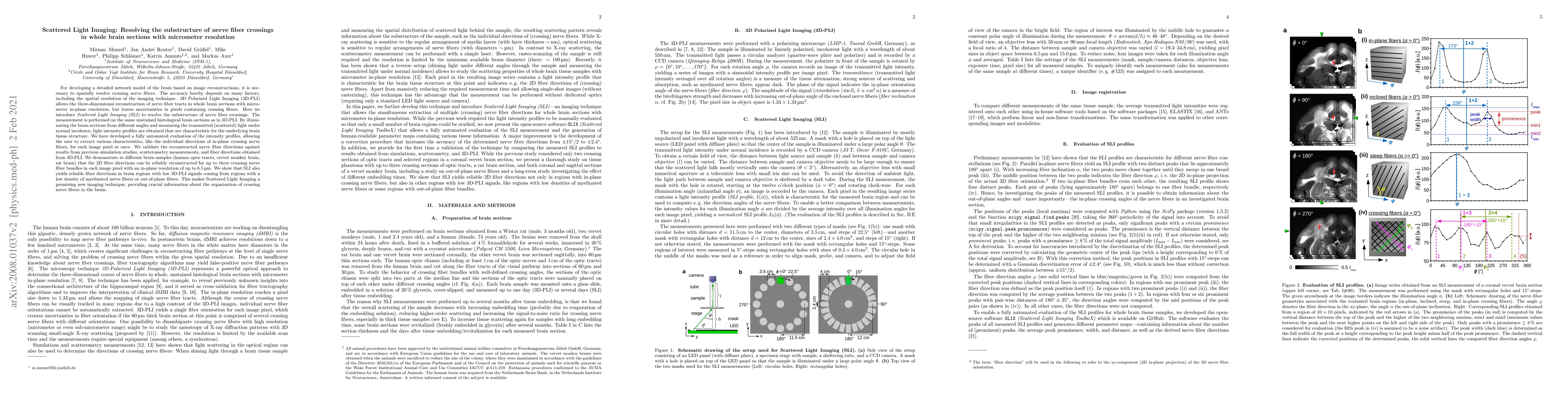 Scattered Light Imaging (SLI) resolves the substructure of nerve fiber crossings in whole brain sections, providing micrometer resolution. Combined with 3D Polarized Light Imaging (3D-PLI), SLI enables accurate reconstruction of three-dimensional nerve fiber architectures, even in regions with low fiber density or out-of-plane fibers.