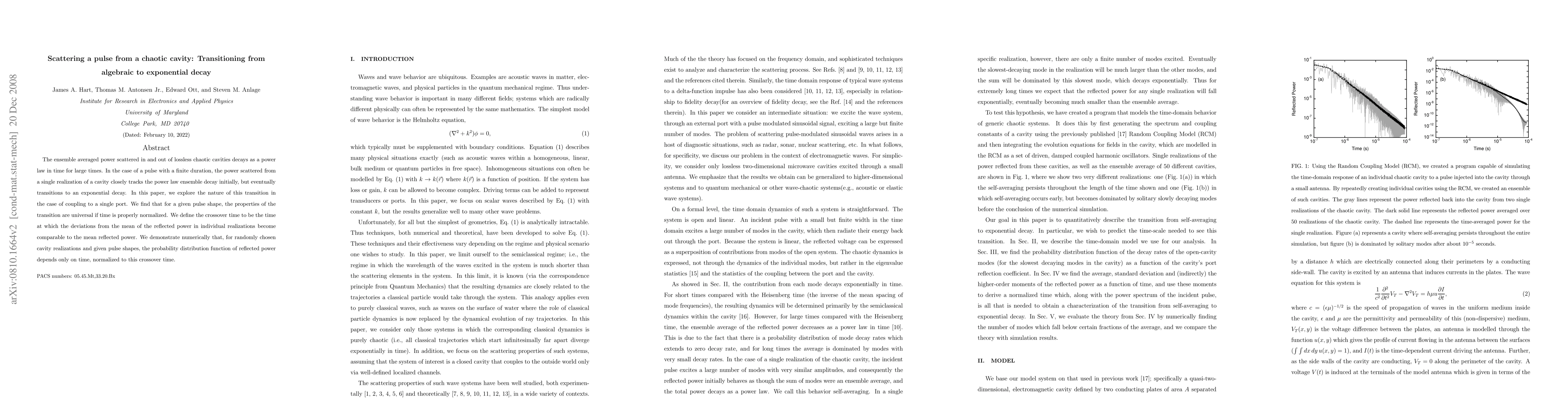 The ensemble averaged power scattered in and out of lossless chaotic cavities decays as a power law in time for large times. In the case of a pulse with a finite duration, the power scattered from a single realization of a cavity closely tracks the power law ensemble decay initially, but eventually transitions to an exponential decay. In this paper, we explore the nature of this transition in the case of coupling to a single port. We find that for a given pulse shape, the properties of the transition are universal if time is properly normalized. We define the crossover time to be the time at which the deviations from the mean of the reflected power in individual realizations become comparable to the mean reflected power. We demonstrate numerically that, for randomly chosen cavity realizations and given pulse shapes, the probability distribution function of reflected power depends only on time, normalized to this crossover time.