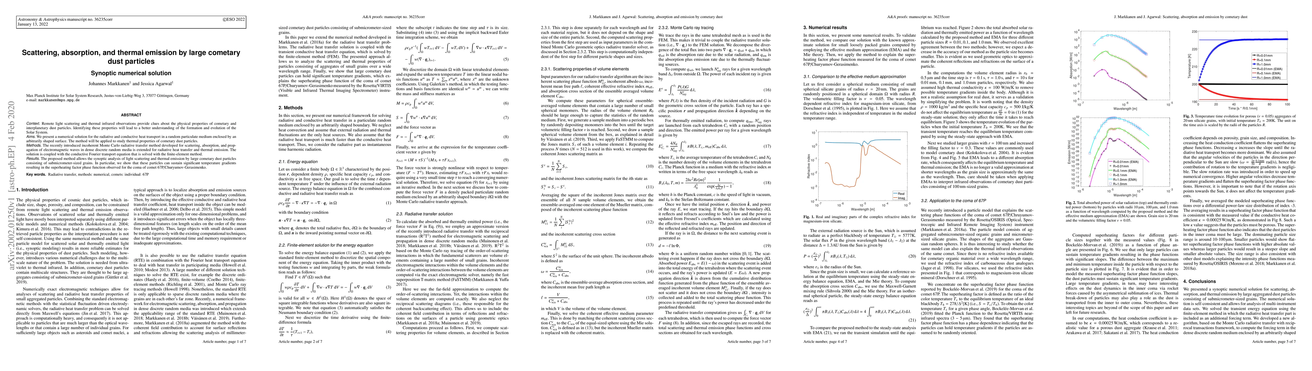 The research presents a numerical solution for radiative and conductive heat transport in a random particulate medium using a coupled finite-element method and Monte Carlo radiative transfer approach, specifically applied to study the thermal properties of cometary dust particles.