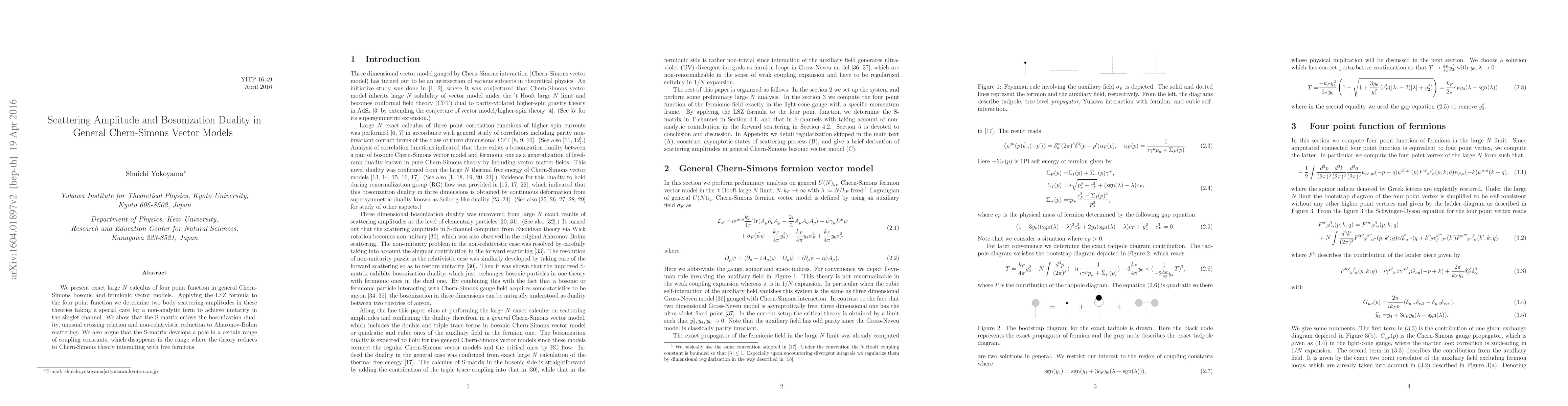 We present exact large N calculus of four point function in general Chern-Simons bosonic and fermionic vector models. Applying the LSZ formula to the four point function we determine two body scattering amplitudes in these theories taking a special care for a non-analytic term to achieve unitarity in the singlet channel. We show that the S-matrix enjoys the bosonization duality, unusual crossing relation and non-relativistic reduction to Aharonov-Bohm scattering. We also argue that the S-matrix develops a pole in a certain range of coupling constants, which disappears in the range where the theory reduces to Chern-Simons theory interacting with free fermions.