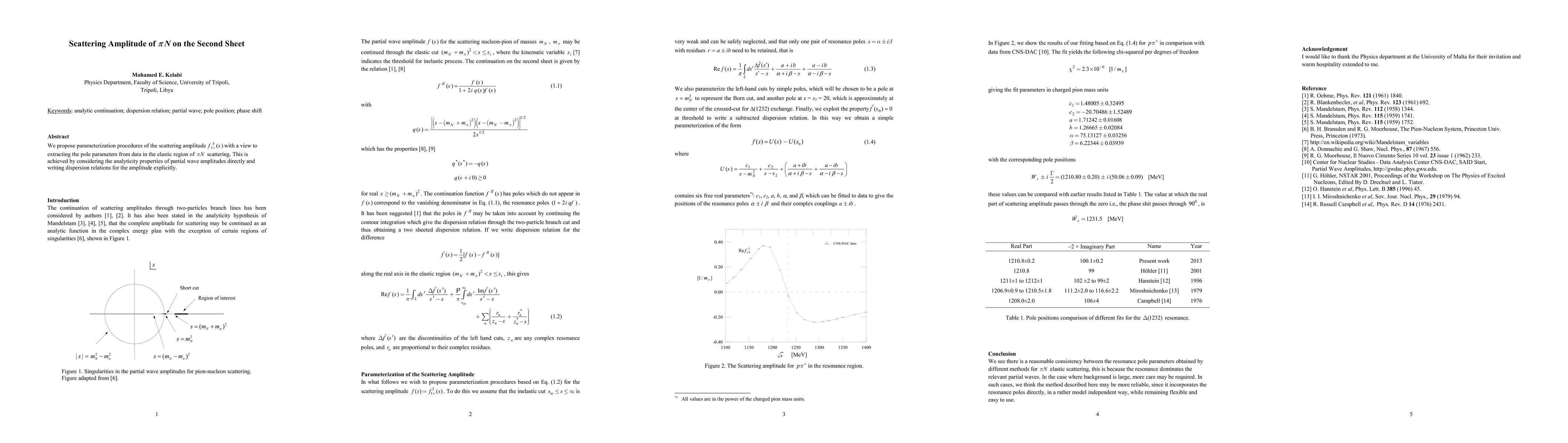 This paper proposes a parameterization method for the scattering amplitude f_{1+}^{3}(s) to extract pole parameters from πN scattering data in the elastic region, utilizing dispersion relations and the analyticity properties of partial wave amplitudes.