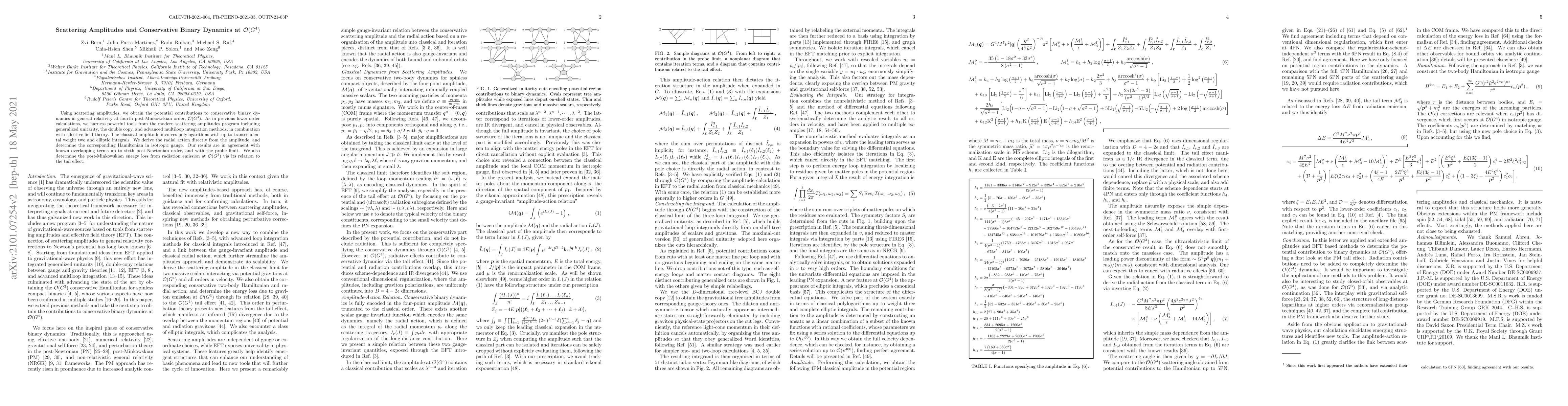 Researchers used scattering amplitudes to calculate conservative binary dynamics in general relativity at fourth post-Minkowskian order, agreeing with known terms up to sixth post-Newtonian order.