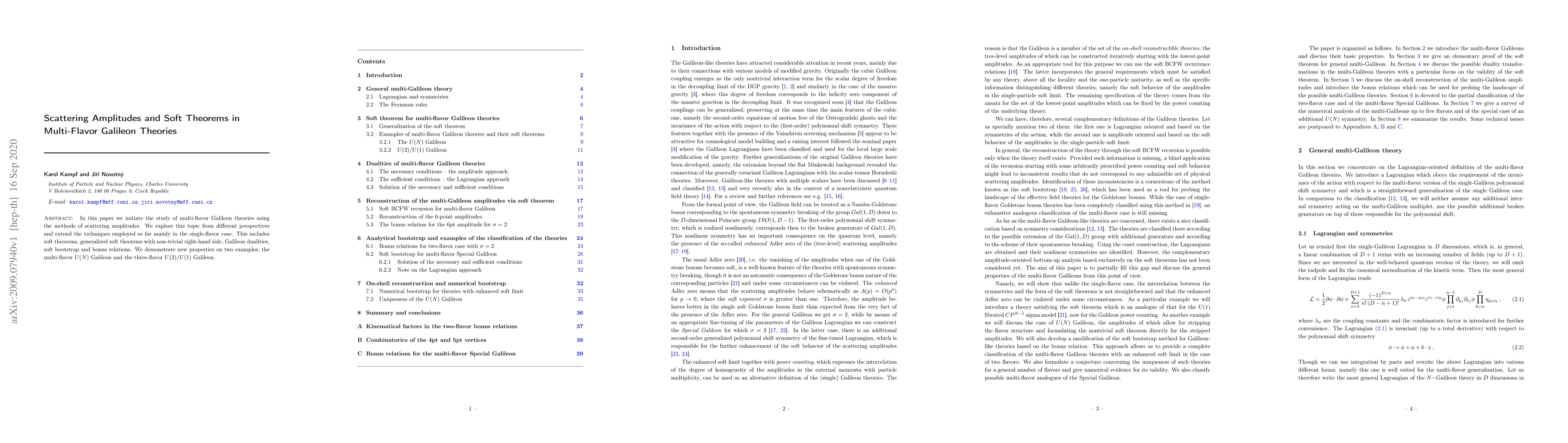 This paper explores scattering amplitudes and soft theorems in multi-flavor Galileon theories, extending single-flavor techniques to include new properties and dualities. It investigates generalized soft theorems, Galileon dualities, and the soft bootstrap, demonstrating results through specific examples like the multi-flavor U(N) and U(2)/U(1) Galileons.