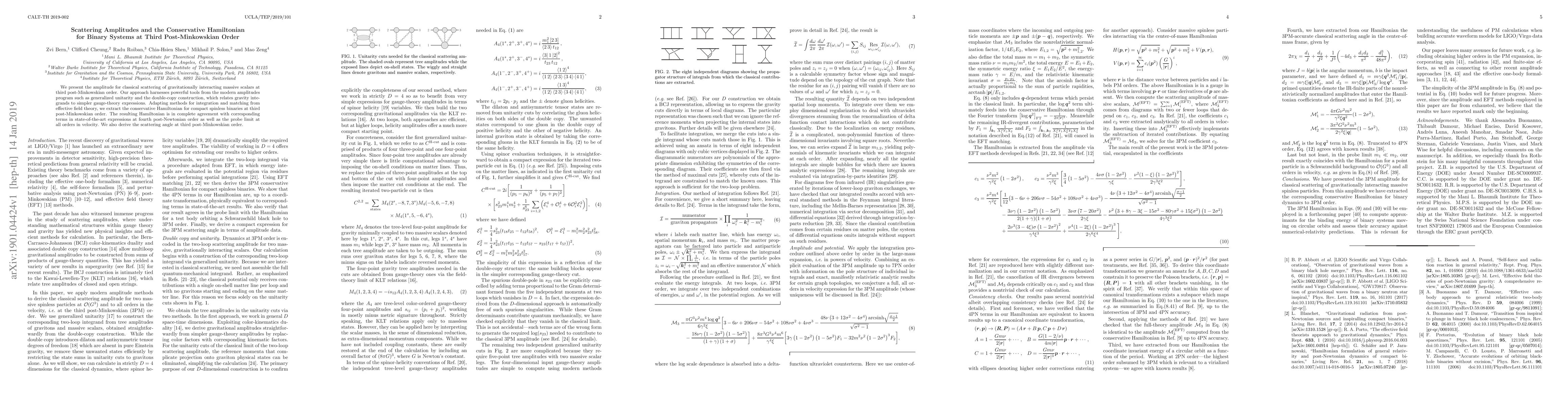 This paper calculates the scattering amplitude for gravitationally interacting massive scalars at third post-Minkowskian order using modern amplitude techniques, and derives the conservative Hamiltonian for compact binaries at this order, matching state-of-the-art expressions at fourth post-Newtonian order.