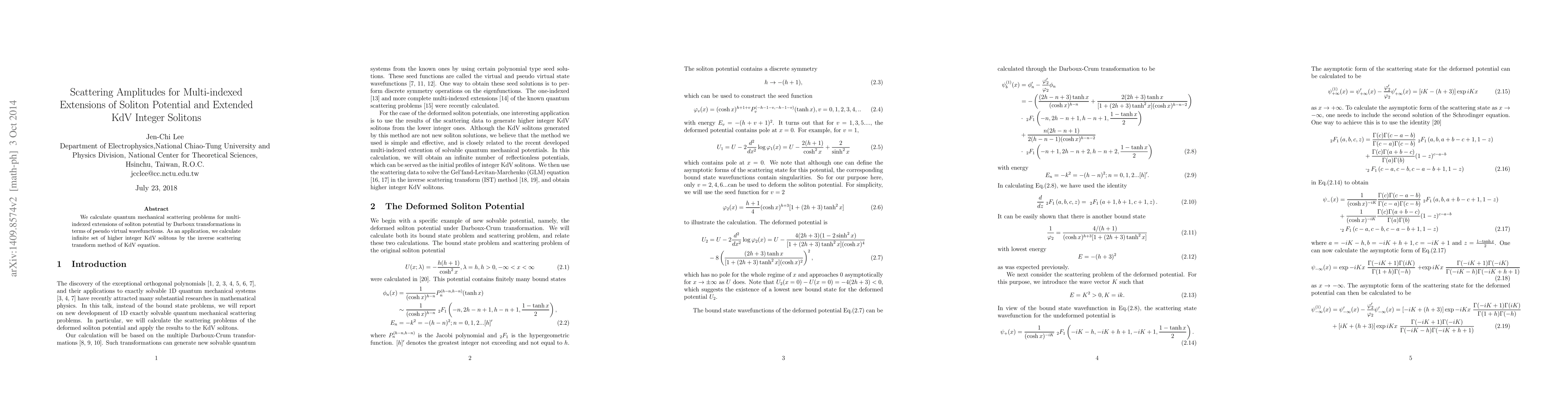 This paper calculates quantum mechanical scattering amplitudes for multi-indexed soliton potentials using Darboux transformations and pseudo virtual wavefunctions. It applies the inverse scattering transform method to derive an infinite set of higher integer KdV solitons.