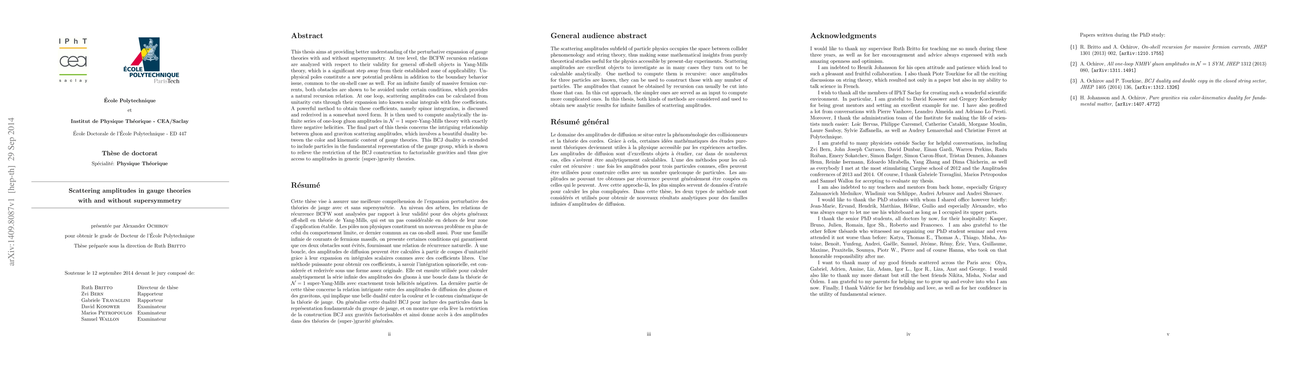 This research explores the perturbative expansion of gauge theories with and without supersymmetry, focusing on the BCFW recursion relations and their application to off-shell objects in Yang-Mills theory. It also investigates the calculation of one-loop scattering amplitudes using spinor integration and extends the BCJ duality to include fundamental representation particles, broadening its applicability to generic (super-)gravity theories.