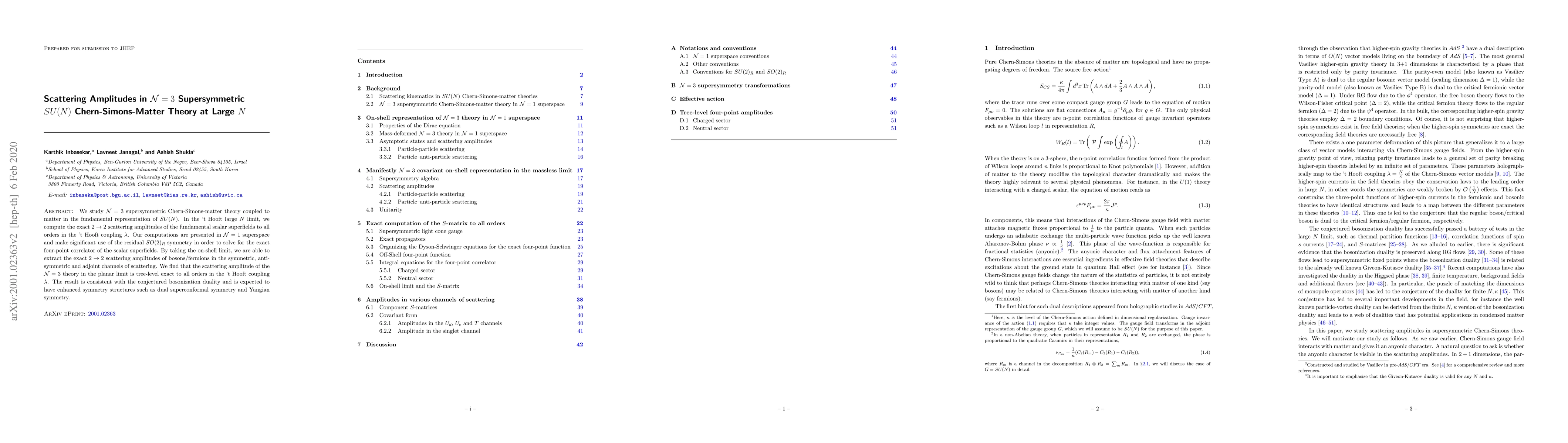 This paper computes exact $2 \to 2$ scattering amplitudes in $\mathcal{N} = 3$ supersymmetric Chern-Simons-matter theory at large $N$ using the 't Hooft large $N$ limit. The results reveal tree-level exactness to all orders in the 't Hooft coupling, consistent with bosonization duality and enhanced symmetry structures.