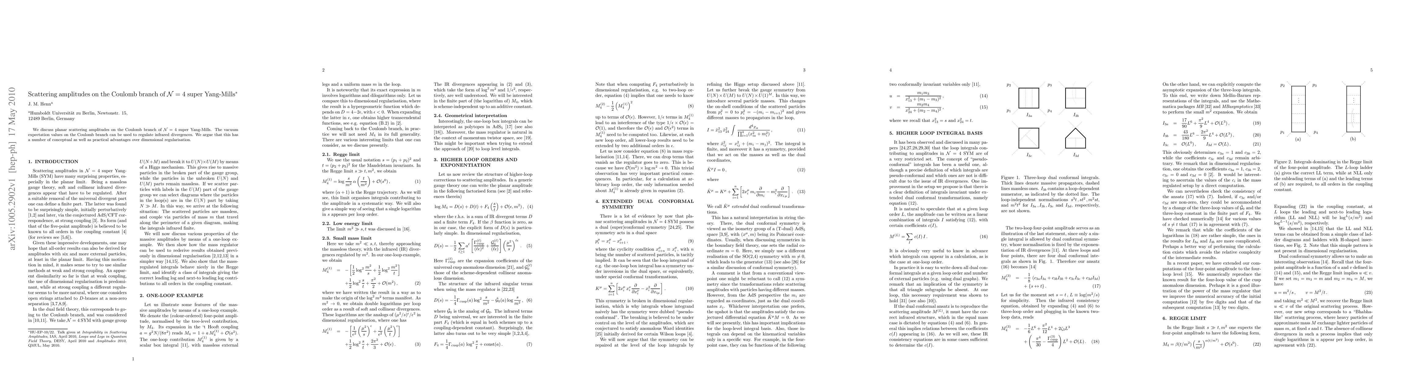 The research discusses planar scattering amplitudes on the Coulomb branch of N=4 super Yang-Mills, using vacuum expectation values to regulate infrared divergences, contrasting it with dimensional regularization.