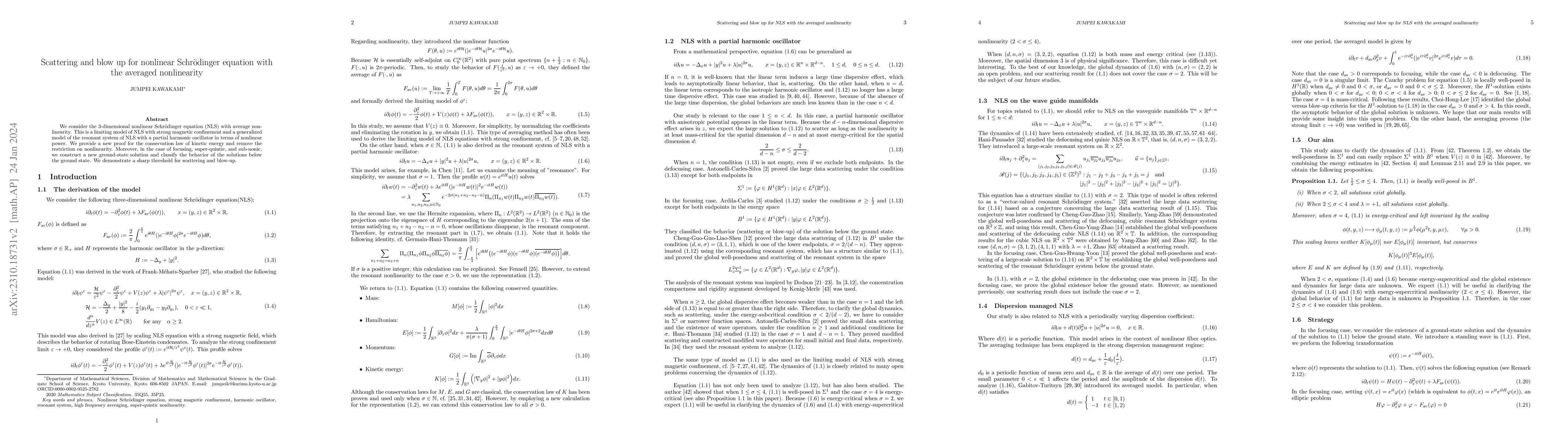 This paper studies the 3-dimensional nonlinear Schrödinger equation with averaged nonlinearity, providing a new proof for kinetic energy conservation and constructing a ground-state solution for super-quintic and sub-quintic cases. It also demonstrates a sharp threshold for scattering and blow-up behavior.