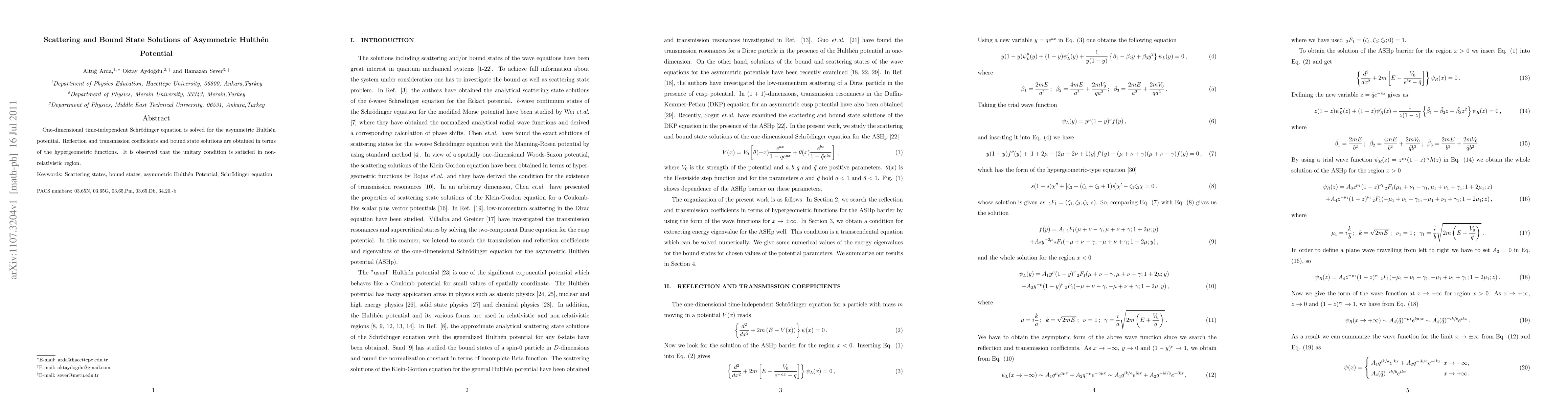 Summary: This paper solves the one-dimensional time-independent Schrödinger equation for the asymmetric Hulthén potential, deriving reflection and transmission coefficients and bound state solutions using hypergeometric functions, and confirms the unitary condition in the non-relativistic region.