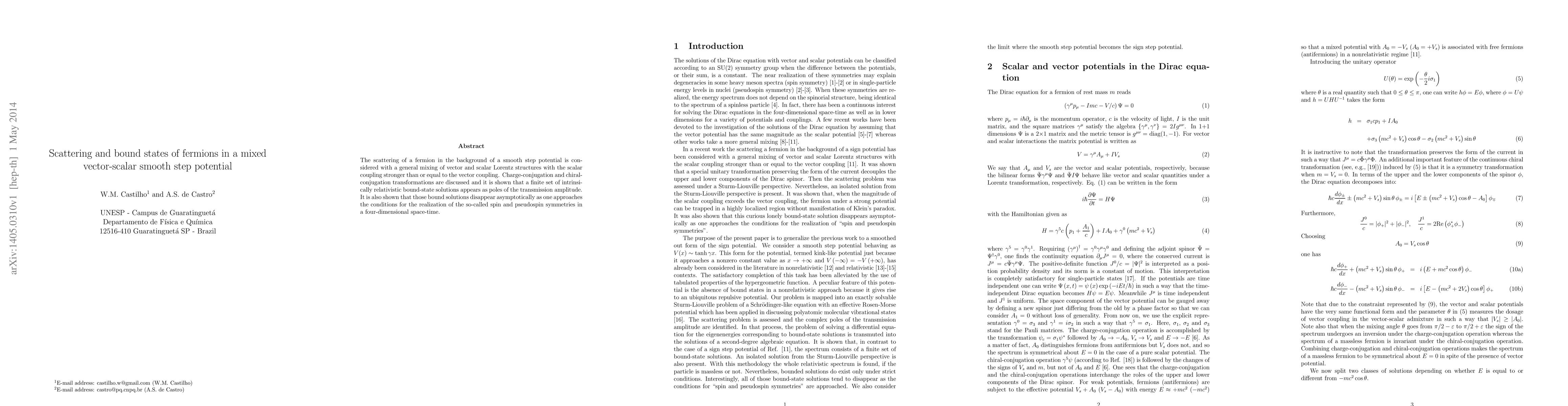 This paper investigates the scattering and bound states of fermions in a mixed vector-scalar smooth step potential, demonstrating the emergence of relativistic bound states as poles in the transmission amplitude. It also reveals that these bound states vanish under conditions promoting spin and pseudospin symmetries in four-dimensional space-time.