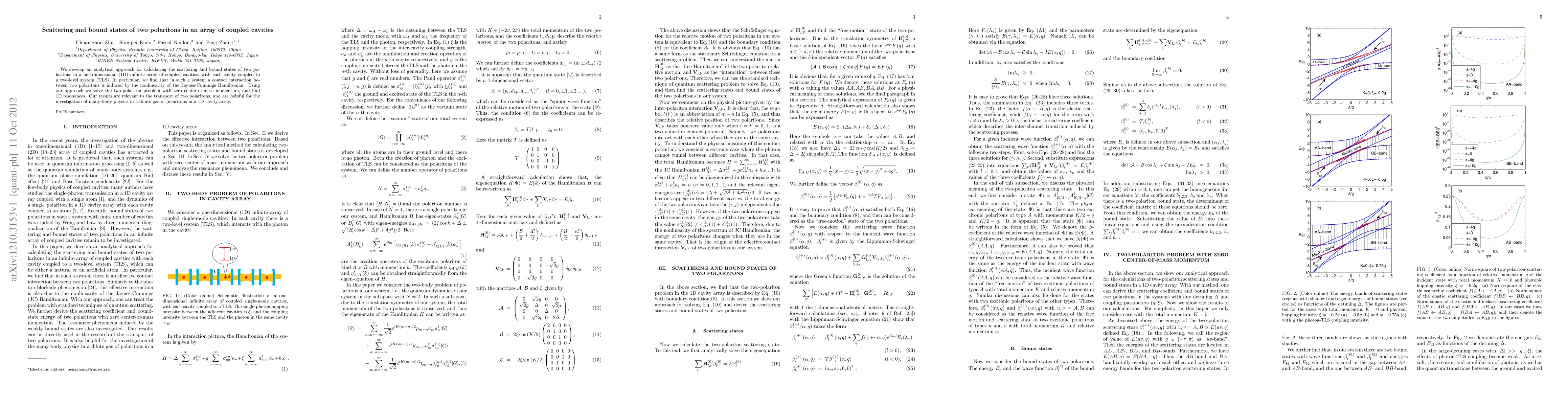 This paper develops an analytical method to study scattering and bound states of two polaritons in a 1D array of coupled cavities, revealing induced contact interactions due to nonlinearity. The approach identifies 1D resonances, which are significant for understanding the transport of polaritons and many-body physics in such systems.
