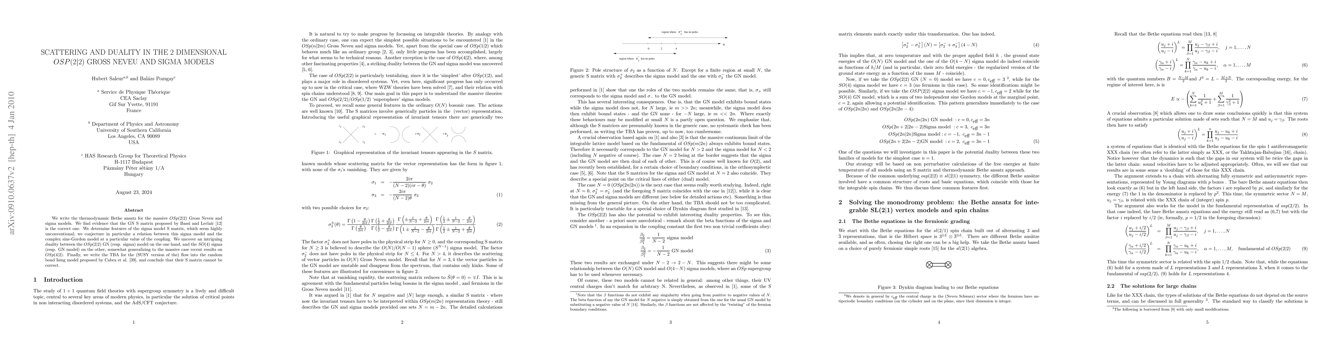 We write the thermodynamic Bethe ansatz for the massive OSp(2|2) Gross Neveu and sigma models. We find evidence that the GN S matrix proposed by Bassi and Leclair [12] is the correct one. We determine features of the sigma model S matrix, which seem highly unconventional; we conjecture in particular a relation between this sigma model and the complex sine-Gordon model at a particular value of the coupling. We uncover an intriguing duality between the OSp(2|2) GN (resp. sigma) model on the one hand, and the SO(4) sigma (resp. GN model) on the other, somewhat generalizing to the massive case recent results on OSp(4|2). Finally, we write the TBA for the (SUSY version of the) flow into the random bond Ising model proposed by Cabra et al. [39], and conclude that their S matrix cannot be correct.