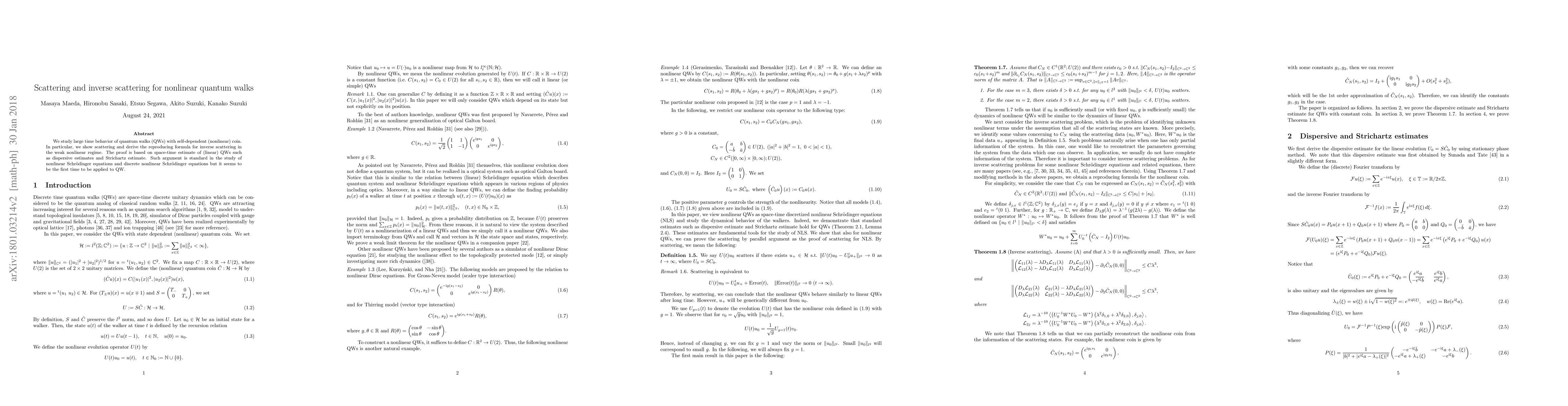 This paper studies large time behavior of quantum walks with nonlinear coins, showing scattering and deriving a reproducing formula for inverse scattering in the weak nonlinear regime. It applies standard arguments from non-linear Schr"odinger equations to quantum walks.