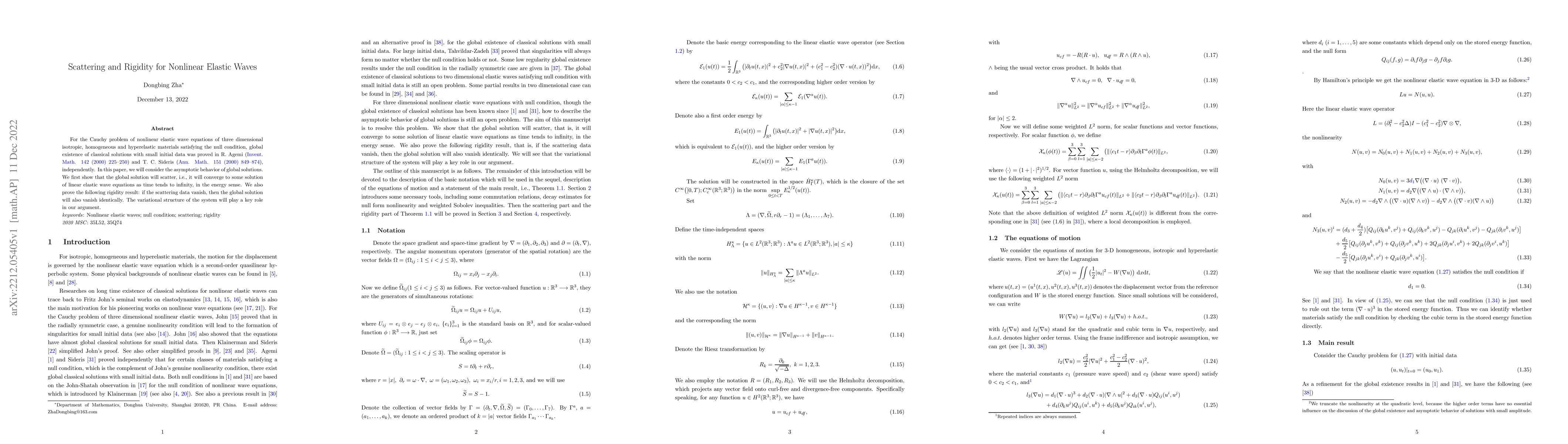 The paper introduces a framework for analyzing the asymptotic behavior of nonlinear elastic wave solutions, utilizing energy methods and pointwise estimates to establish scattering and rigidity properties.