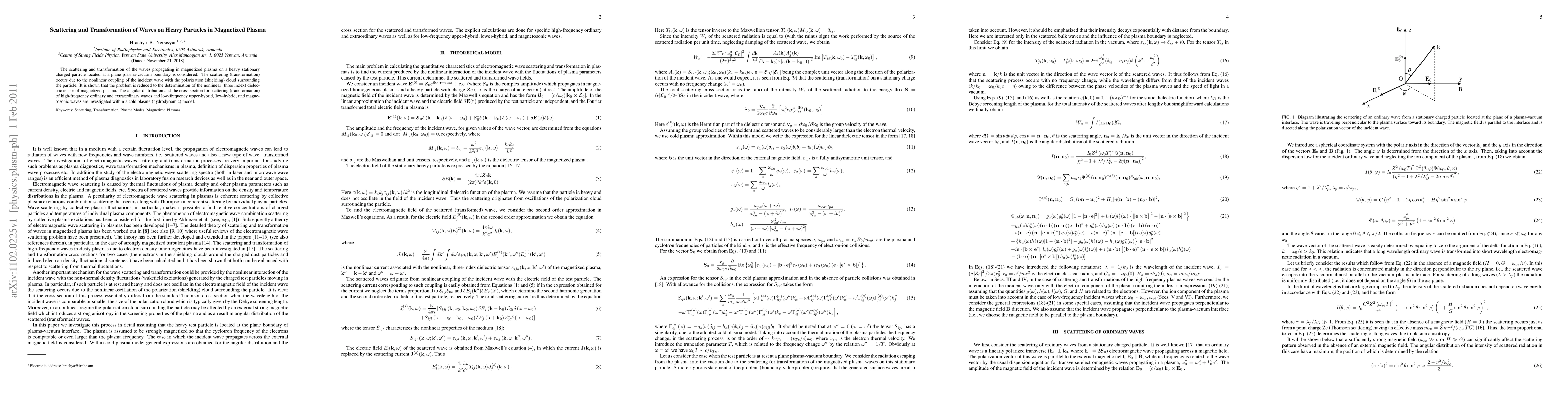 This paper investigates the scattering and transformation of waves in magnetized plasma due to a heavy particle at a plasma-vacuum boundary, focusing on the nonlinear dielectric tensor. It analyzes the angular distribution and cross sections for various wave types using a cold plasma model.