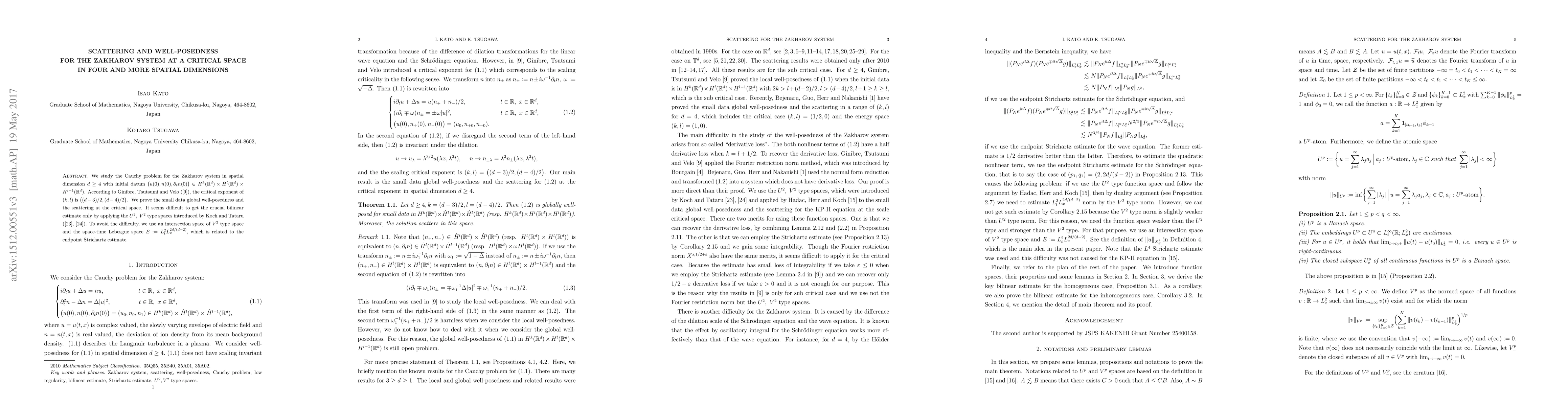 We study the Cauchy problem for the Zakharov system in spatial dimension $d\ge 4$ with initial datum $(u(0), n(0), \partial_t n(0)) \in H^k(\mathbb{R}^d) \times \dot{H}^l(\mathbb{R}^d)\times \dot{H}^{l-1}(\mathbb{R}^d)$. According to Ginibre, Tsutsumi and Velo, the critical exponent of $(k,l)$ is $((d-3)/2,(d-4)/2)$. We prove the scattering and the small data global well-posedness at the critical space. It seems difficult to get the crucial bilinear estimate only by applying the $U^2,\ V^2$ type spaces introduced by Koch-Tataru. To avoid the difficulty, we use an intersection space of $V^2$ type space and the space-time Lebesgue space $L^2_tL_x^{2d/(d-2)}$, which is related to the endpoint Strichartz estimate.