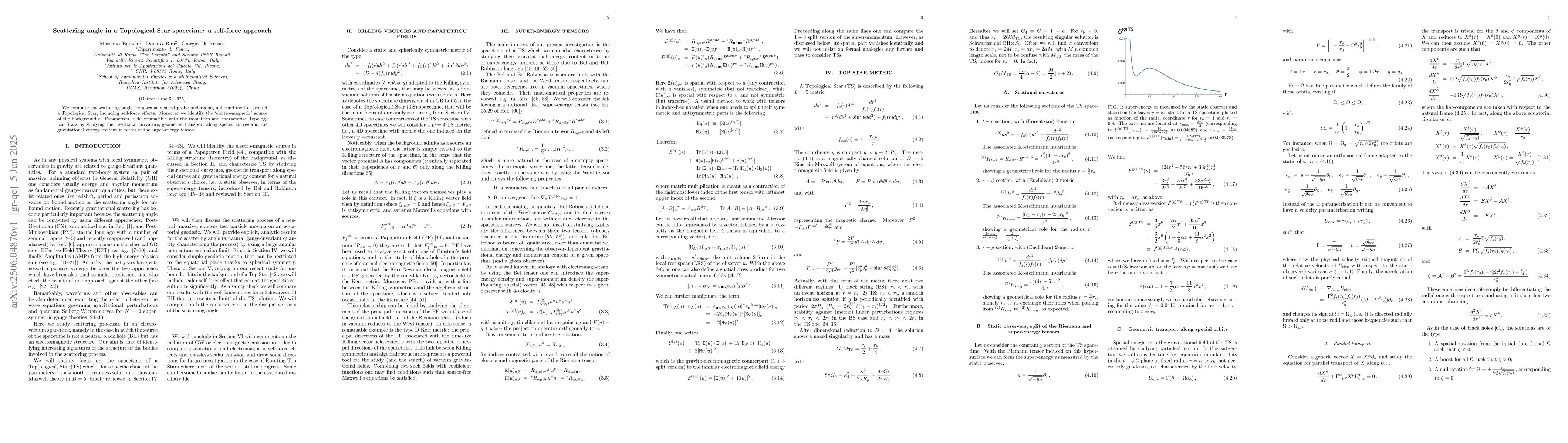 We compute the scattering angle for a scalar neutral probe undergoing unbound motion around a Topological Star, including self-force effects. Moreover we identify the `electro-magnetic' source of the background as Papapetrou Field compatible with the isometries and characterize Topological Stars by studying their sectional curvature, geometric transport along special curves and the gravitational energy content in terms of the super-energy tensors.