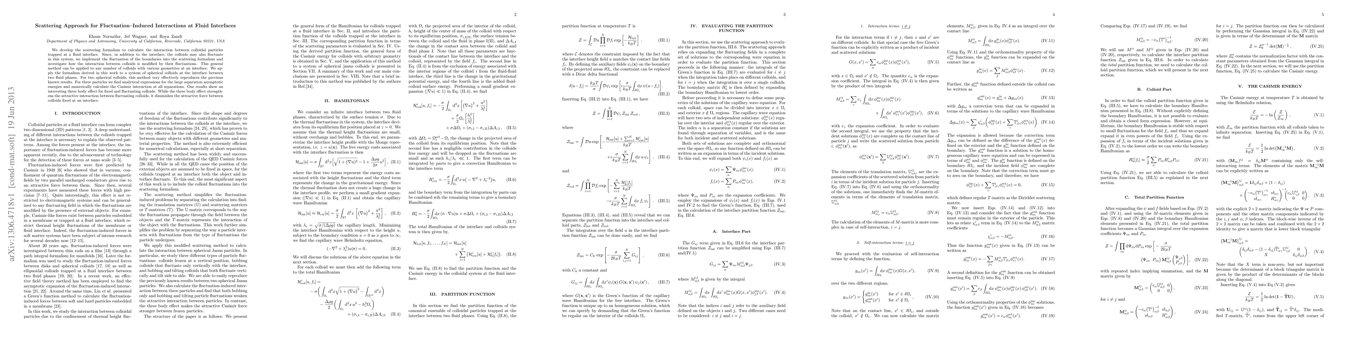 This paper develops a scattering formalism to analyze interactions between colloidal particles at fluid interfaces, incorporating boundary fluctuations. It applies this method to spherical colloids, showing that three-body effects enhance attraction for fluctuating colloids but reduce it for fixed ones.