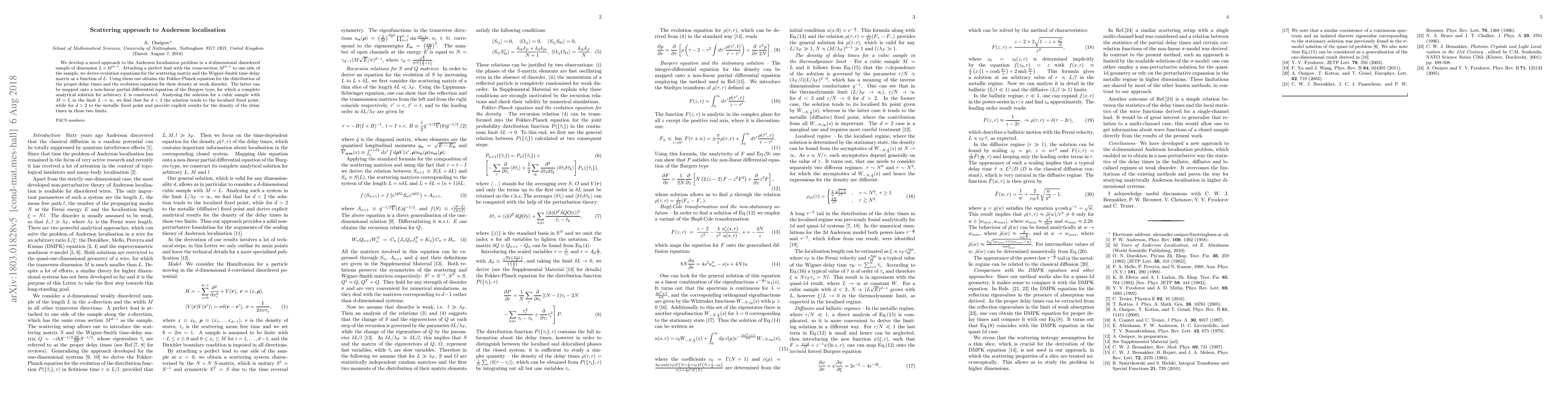We develop a novel approach to the Anderson localisation problem in a $d$-dimensional disordered sample of dimension $L\times M^{d-1}$. Attaching a perfect lead with the cross-section $M^{d-1}$ to one side of the sample, we derive evolution equations for the scattering matrix and the Wigner-Smith time delay matrix as a function of $L$. Using them one obtains the Fokker-Planck equation for the distribution of the proper delay times and the evolution equation for their density at weak disorder. The latter can be mapped onto a non-linear partial differential equation of the Burgers type, for which a complete analytical solution for arbitrary $L$ is constructed. Analysing the solution for a cubic sample with $M=L$ in the limit $L\to \infty$, we find that for $d<2$ the solution tends to the localised fixed point, while for $d>2$ to the metallic fixed point and provide explicit results for the density of the delay times in these two limits.