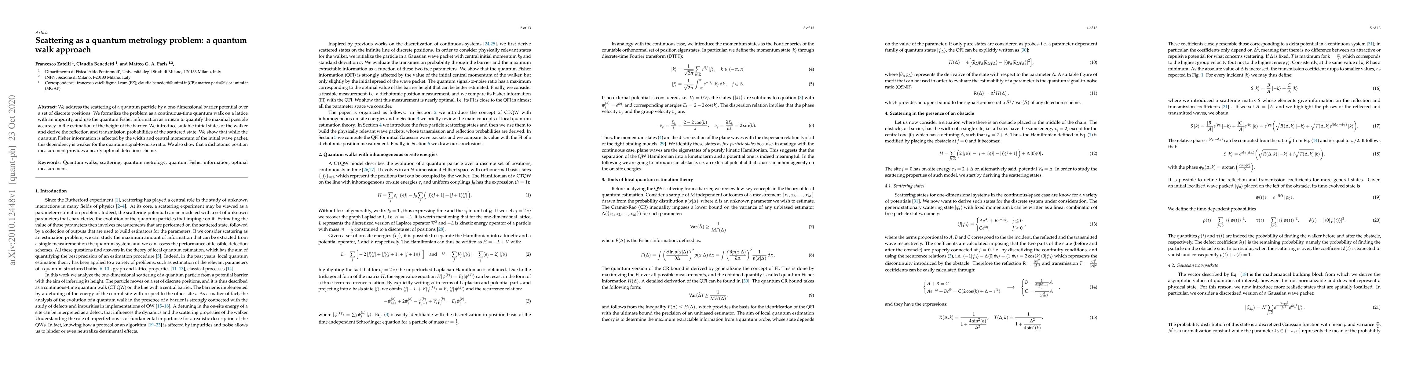 This research uses quantum walks to study scattering of a particle by a barrier, quantifying estimation accuracy of the barrier height via quantum Fisher information. It shows that while this accuracy depends on initial wave packet width and momentum, the dependence is weaker for the quantum signal-to-noise ratio. The study also reveals that dichotomic position measurements serve as nearly optimal detection schemes.