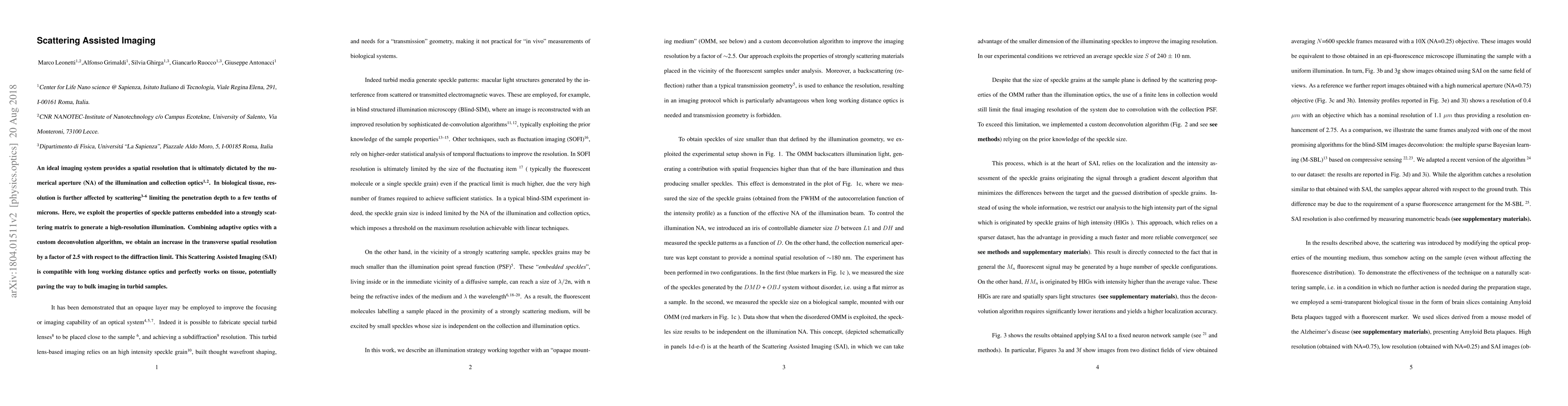 Researchers developed Scattering Assisted Imaging (SAI) that uses speckle patterns to improve spatial resolution in biological tissue, increasing it by a factor of 2.5 beyond the diffraction limit.