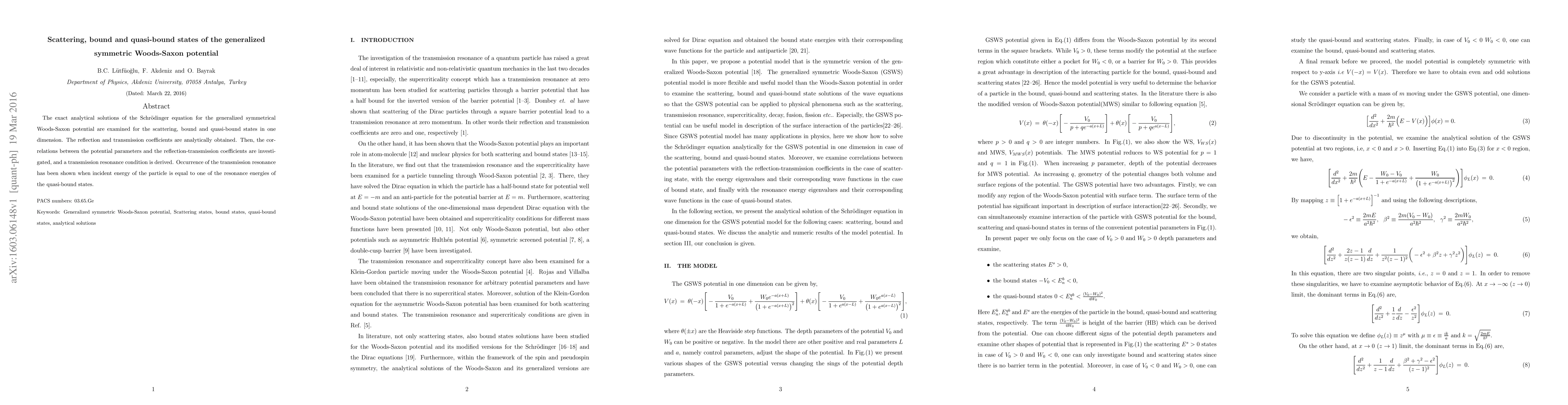 This paper provides exact analytical solutions for the Schrödinger equation under the generalized symmetric Woods-Saxon potential, examining scattering, bound, and quasi-bound states in one dimension. It derives reflection and transmission coefficients and explores their dependence on potential parameters, identifying a transmission resonance condition activated when the incident energy matches a quasi-bound state resonance energy.