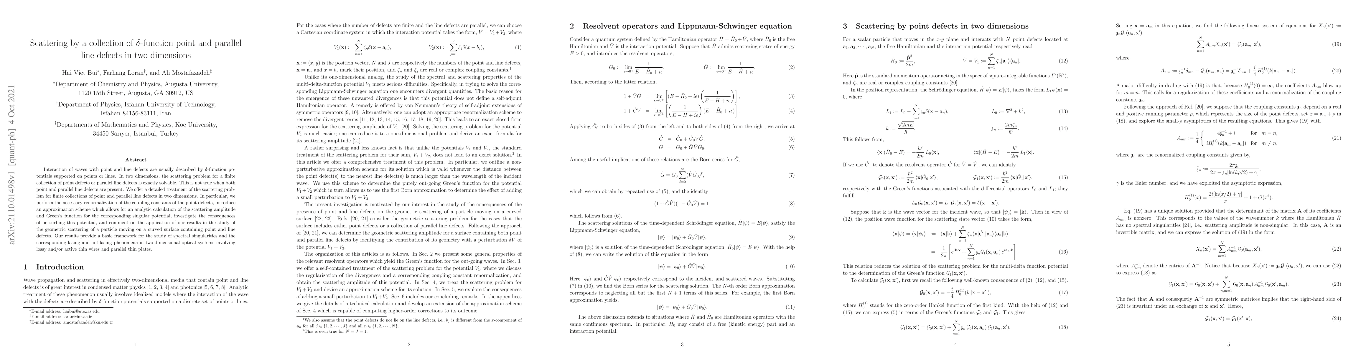 The research presents a detailed treatment of the scattering problem for finite collections of point and parallel line defects in two dimensions, employing renormalization of coupling constants, an approximation scheme for scattering amplitude and Green's function, and an analysis of perturbations to the potential.