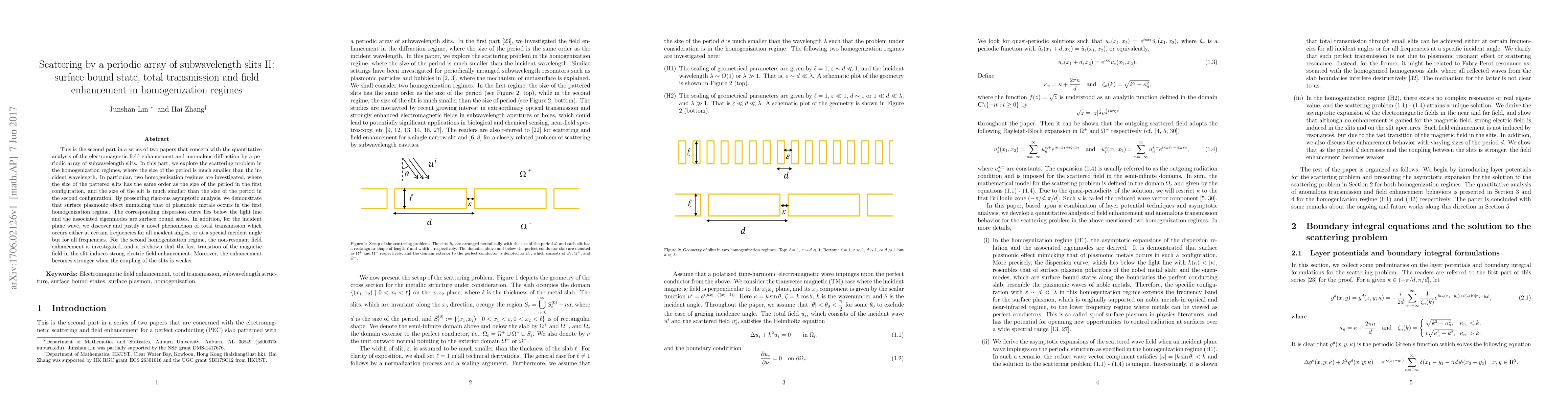 This paper investigates electromagnetic scattering by a periodic array of subwavelength slits in homogenization regimes, revealing surface plasmonic effects and total transmission phenomena. It also explores non-resonant field enhancement due to the fast transition of magnetic fields in the slits, with stronger enhancement observed under weaker coupling.