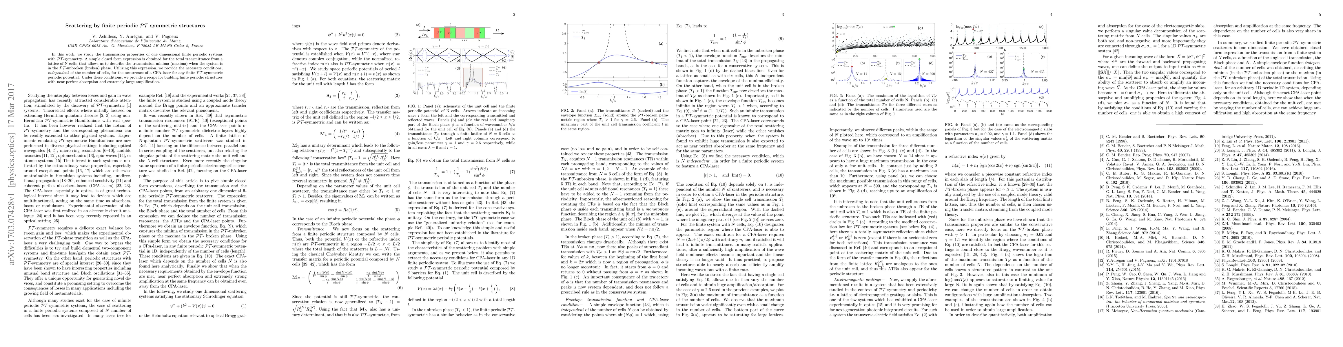 This paper investigates the transmission properties of one-dimensional finite periodic $\mathcal{PT}$-symmetric systems, deriving a closed form expression for total transmittance. It identifies conditions for achieving near perfect absorption and large amplification in $\mathcal{PT}$-symmetric periodic structures, independent of the number of cells.
