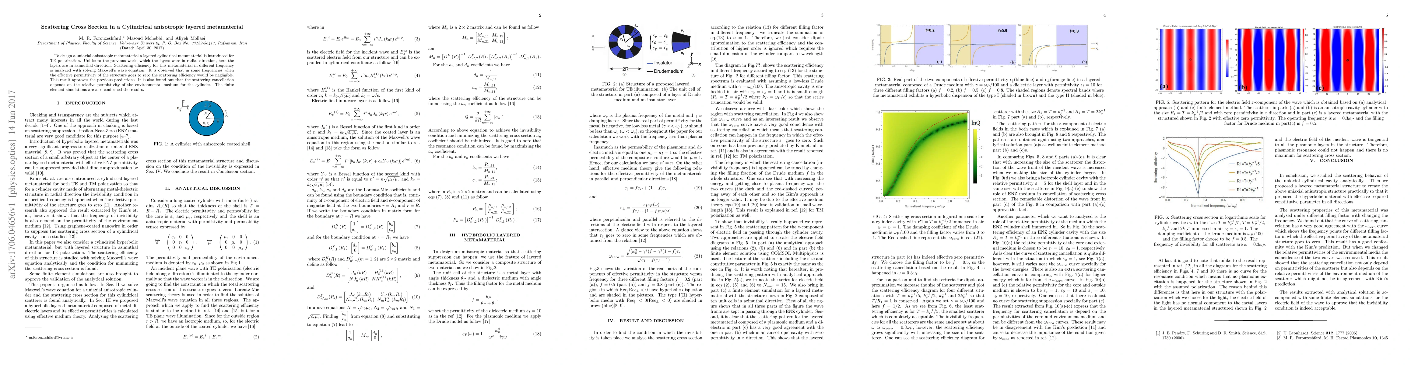 To design a uniaxial anisotropic metamaterial a layered cylindrical metamaterial is introduced for TE polarization. Unlike to the previous work, which the layers were in radial direction, here the layers are in azimuthal direction. Scattering efficiency for this metamaterial in different frequency is analyzed with solving Maxwell's wave equation. It is observed that in some frequencies when the effective permittivity of the structure goes to zero the scattering efficiency would be negligible. This result approves the previous predictions. It is also found out that the scattering cancellation depends on the relative permittivity of the environmental medium for the cylinder. The finite element simulations are also confirmed the results.