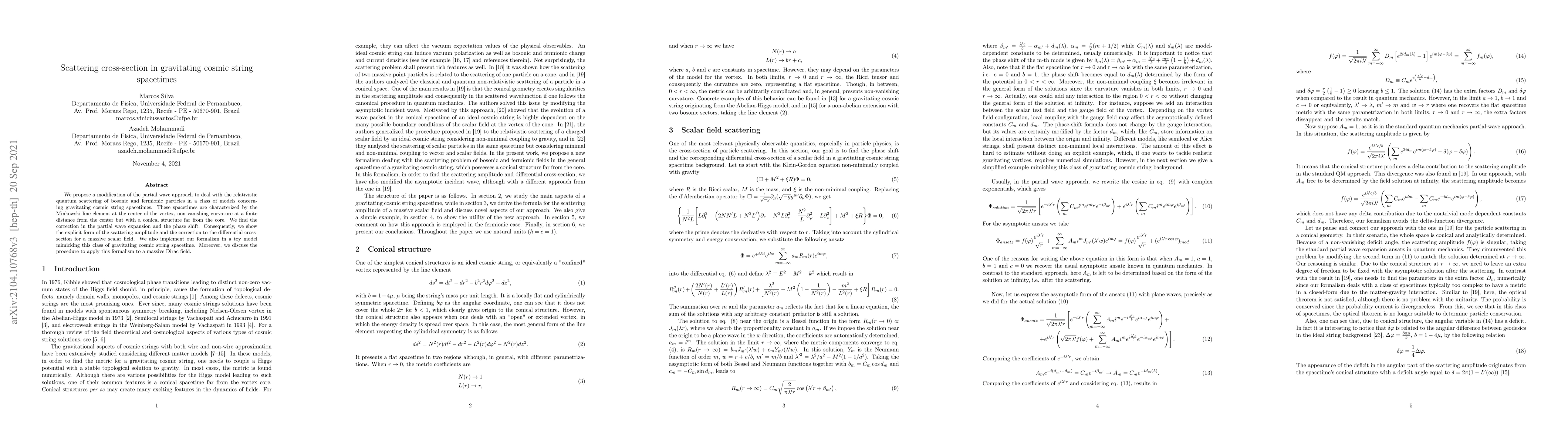 We propose a modification of the partial wave approach to deal with the relativistic quantum scattering of bosonic and fermionic particles in a class of models concerning gravitating cosmic string spacetimes. These spacetimes are characterized by the Minkowski line element at the center of the vortex, non-vanishing curvature at a finite distance from the center but with a conical structure far from the core. We find the correction in the partial wave expansion and the phase shift. Consequently, we show the explicit form of the scattering amplitude and the correction to the differential cross-section for a massive scalar field. We also implement our formalism in a toy model mimicking this class of gravitating cosmic string spacetime. Moreover, we discuss the procedure to apply this formalism to a massive Dirac field.
