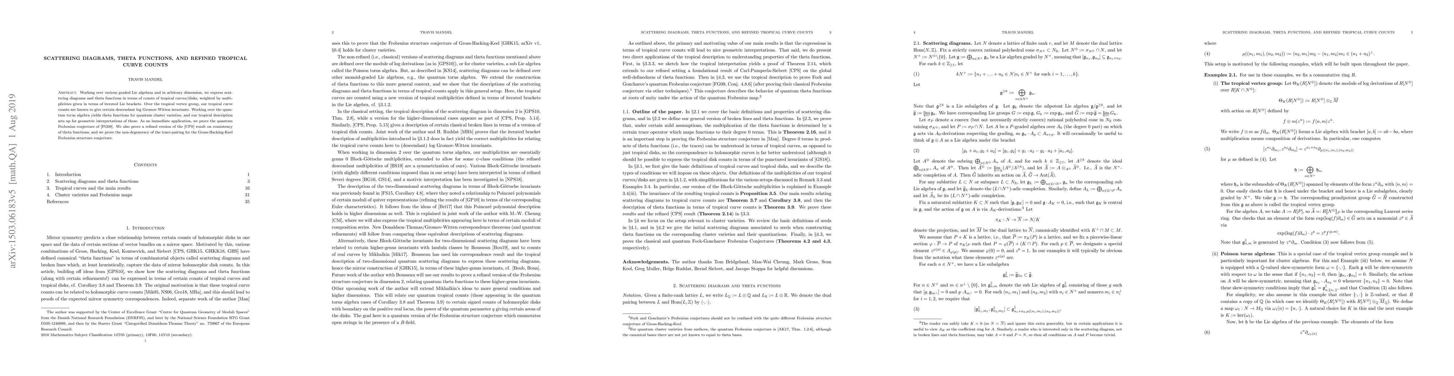 This paper connects scattering diagrams, theta functions, and tropical curve counts through graded Lie algebras, showing that tropical curve counts yield descendant log Gromov-Witten invariants. It applies these connections to prove the quantum Frobenius conjecture and a refined version of the consistency of theta functions, alongside the non-degeneracy of the trace-pairing for the Frobenius structure conjecture.