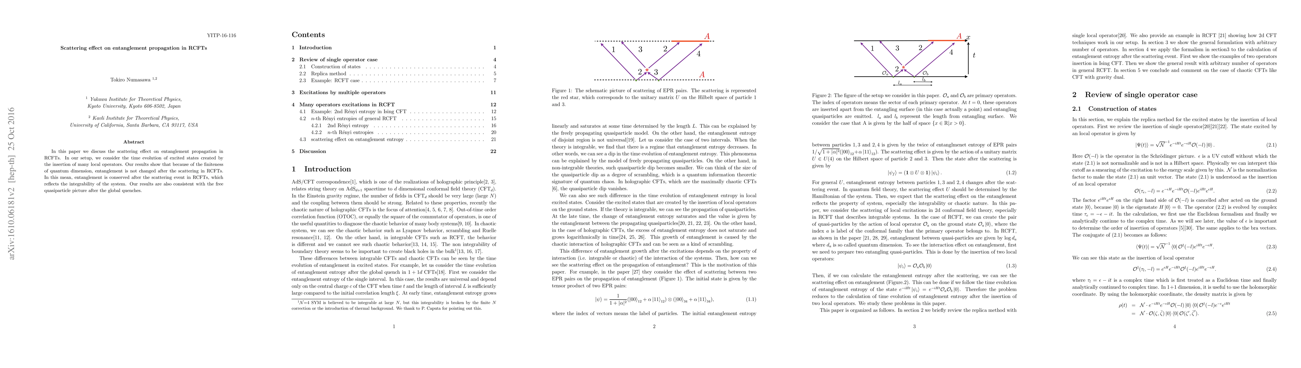 In this paper we discuss the scattering effect on entanglement propagation in RCFTs. In our setup, we consider the time evolution of excited states created by the insertion of many local operators. Our results show that because of the finiteness of quantum dimension, entanglement is not changed after the scattering in RCFTs. In this mean, entanglement is conserved after the scattering event in RCFTs, which reflects the integrability of the system. Our results are also consistent with the free quasiparticle picture after the global quenches.