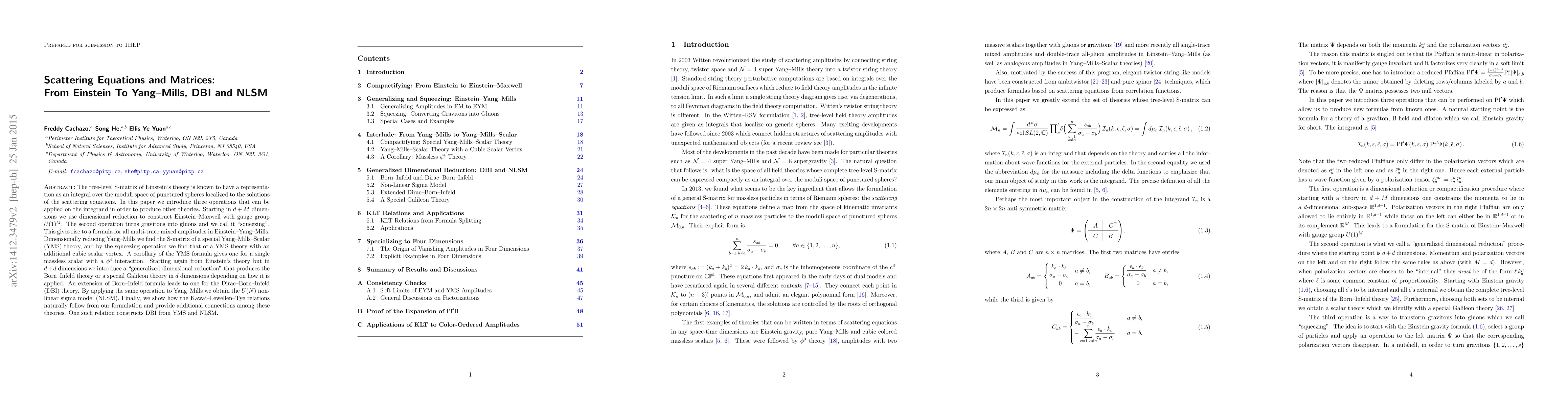The tree-level S-matrix of Einstein's theory is known to have a representation as an integral over the moduli space of punctured spheres localized to the solutions of the scattering equations. In this paper we introduce three operations that can be applied on the integrand in order to produce other theories. Starting in $d+M$ dimensions we use dimensional reduction to construct Einstein-Maxwell with gauge group $U(1)^M$. The second operation turns gravitons into gluons and we call it "squeezing". This gives rise to a formula for all multi-trace mixed amplitudes in Einstein-Yang-Mills. Dimensionally reducing Yang-Mills we find the S-matrix of a special Yang-Mills-Scalar (YMS) theory, and by the squeezing operation we find that of a YMS theory with an additional cubic scalar vertex. A corollary of the YMS formula gives one for a single massless scalar with a $\phi^4$ interaction. Starting again from Einstein's theory but in $d+d$ dimensions we introduce a "generalized dimensional reduction" that produces the Born-Infeld theory or a special Galileon theory in $d$ dimensions depending on how it is applied. An extension of Born-Infeld formula leads to one for the Dirac-Born-Infeld (DBI) theory. By applying the same operation to Yang-Mills we obtain the $U(N)$ non-linear sigma model (NLSM). Finally, we show how the Kawai-Lewellen-Tye relations naturally follow from our formulation and provide additional connections among these theories. One such relation constructs DBI from YMS and NLSM.