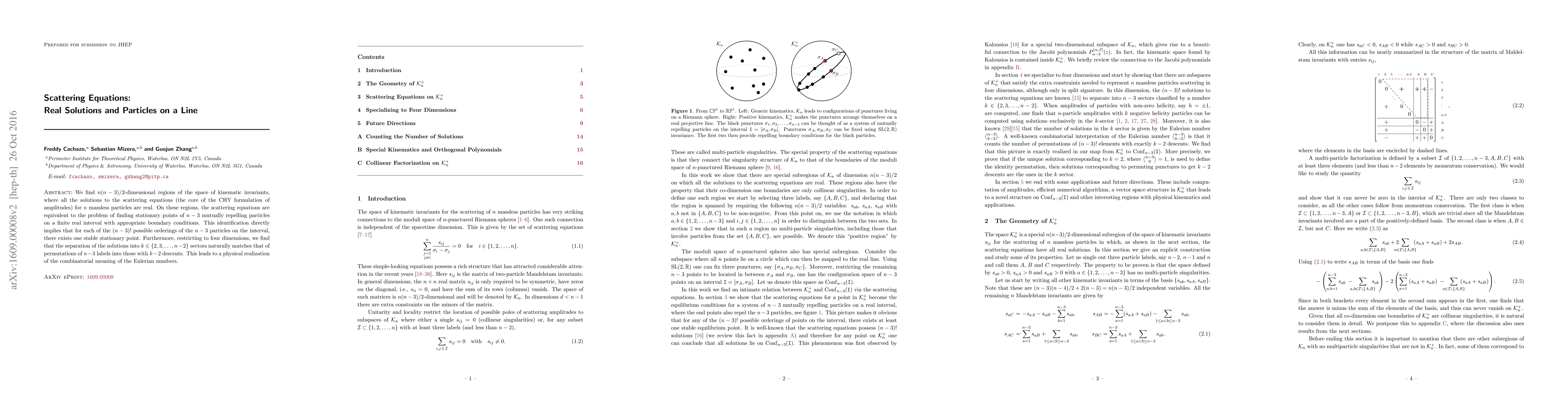 We find $n(n-3)/2$-dimensional regions of the space of kinematic invariants, where all the solutions to the scattering equations (the core of the CHY formulation of amplitudes) for $n$ massless particles are real. On these regions, the scattering equations are equivalent to the problem of finding stationary points of $n-3$ mutually repelling particles on a finite real interval with appropriate boundary conditions. This identification directly implies that for each of the $(n-3)!$ possible orderings of the $n-3$ particles on the interval, there exists one stable stationary point. Furthermore, restricting to four dimensions, we find that the separation of the solutions into $k\in \{2,3,\ldots ,n-2\}$ sectors naturally matches that of permutations of $n-3$ labels into those with $k-2$ descents. This leads to a physical realization of the combinatorial meaning of the Eulerian numbers.