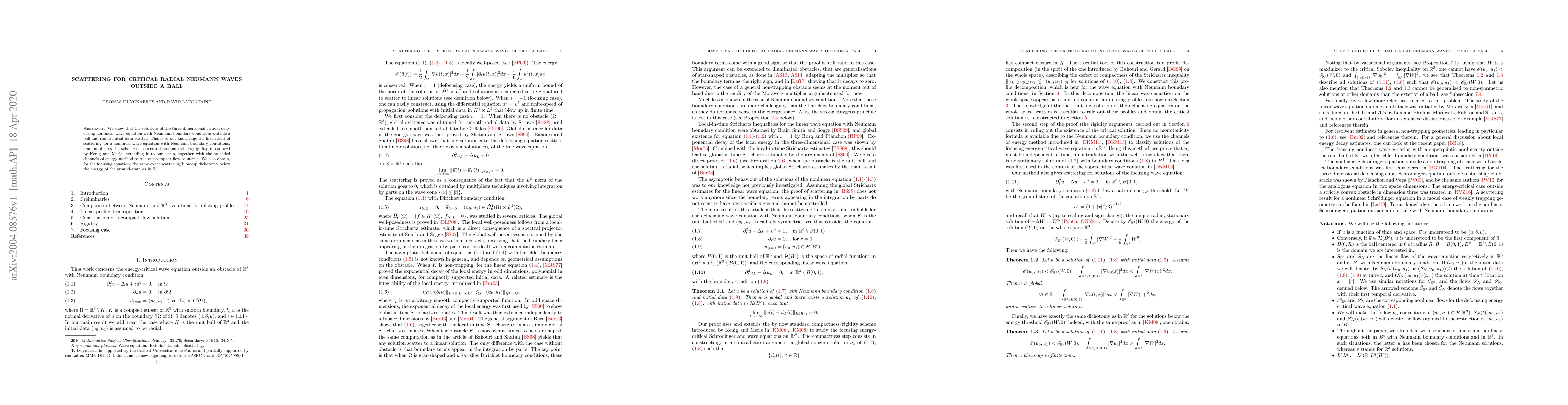 The paper proves scattering for nonlinear wave equations with Neumann boundary conditions outside a ball in three dimensions, utilizing concentration-compactness/rigidity and channels of energy methods. It also establishes the same scattering/blow-up dichotomy for the focusing equation as in $mathbb R^3$ below the ground-state energy.