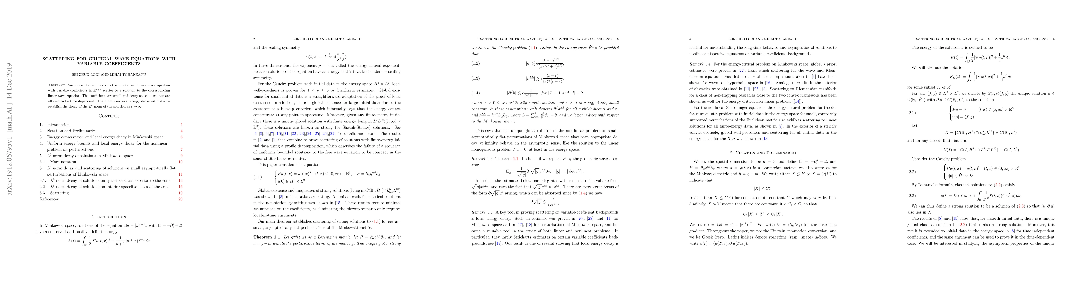 We prove that solutions to the quintic semilinear wave equation with variable coefficients in $\mathbb R^{1+3}$ scatter to a solution to the corresponding linear wave equation. The coefficients are small and decay as $|x|\to\infty$, but are allowed to be time dependent. The proof uses local energy decay estimates to establish the decay of the $L^6$ norm of the solution as $t\to\infty$.