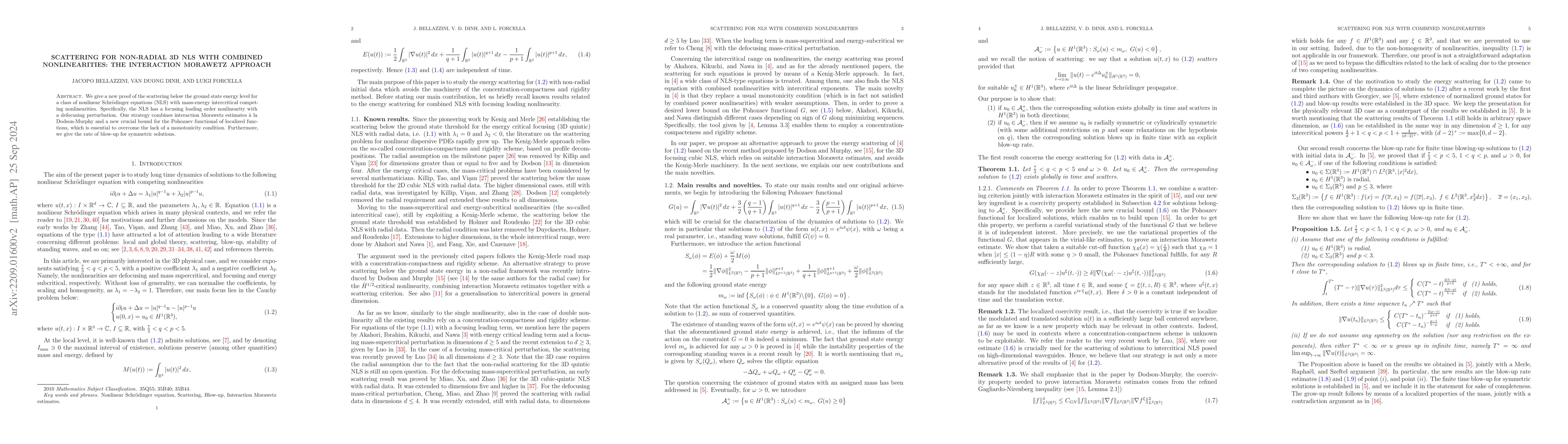This paper demonstrates scattering for a class of 3D nonlinear Schrödinger equations with competing nonlinearities, using Morawetz estimates and a novel bound for the Pohozaev functional. It also provides the rate of blow-up for symmetric solutions.