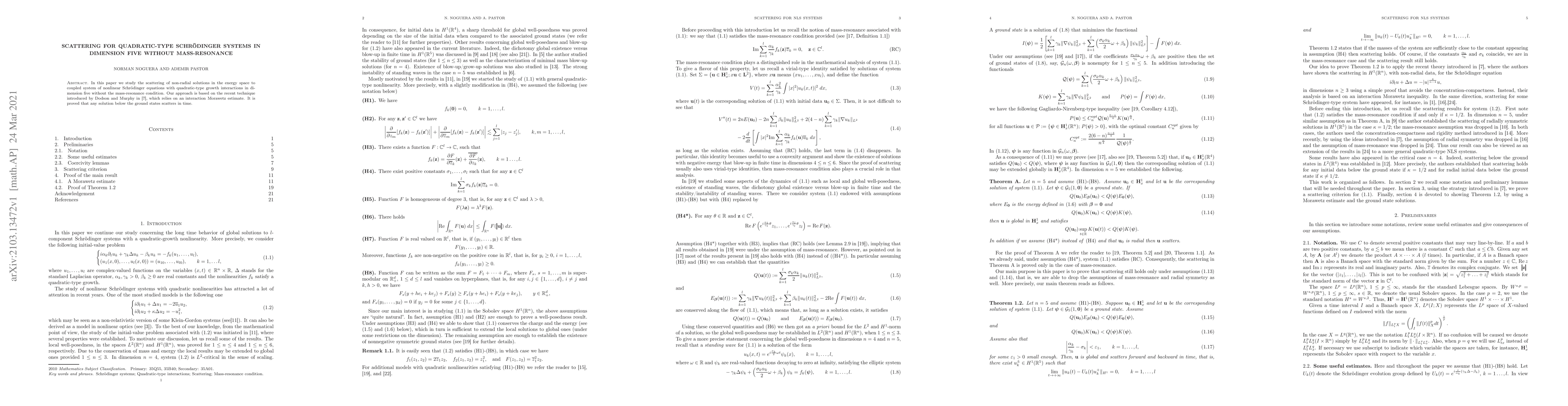 In this paper we study the scattering of non-radial solutions in the energy space to coupled system of nonlinear Schr\"{o}dinger equations with quadratic-type growth interactions in dimension five without the mass-resonance condition. Our approach is based on the recent technique introduced by Dodson and Murphy, which relies on an interaction Morawetz estimate. It is proved that any solution below the ground states scatters in time.