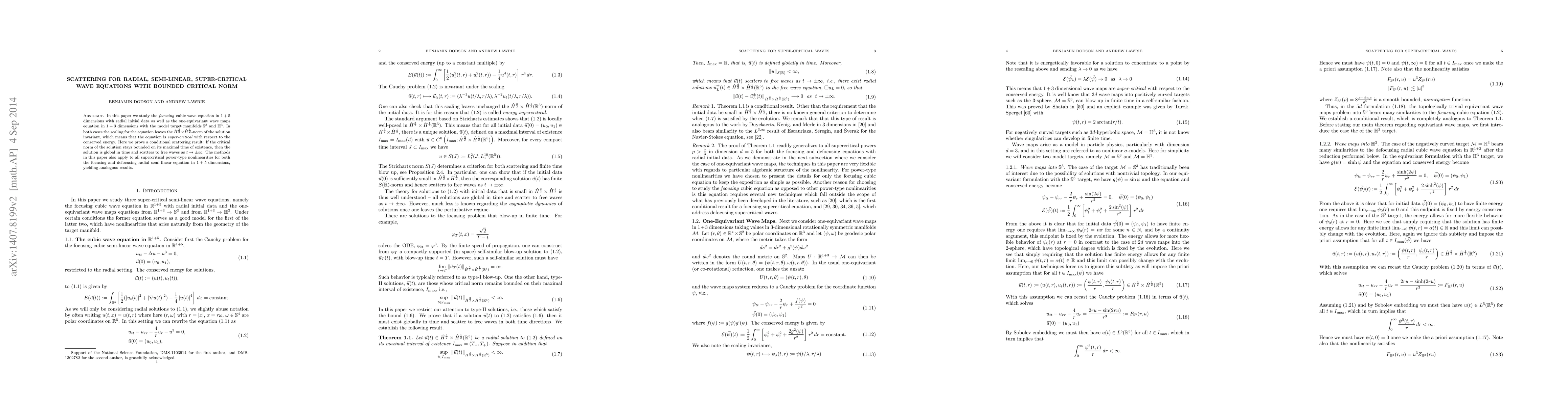 In this paper we study the focusing cubic wave equation in 1+5 dimensions with radial initial data as well as the one-equivariant wave maps equation in 1+3 dimensions with the model target manifolds $\mathbb{S}^3$ and $\mathbb{H}^3$. In both cases the scaling for the equation leaves the $\dot{H}^{\frac{3}{2}} \times \dot{H}^{\frac{1}{2}}$-norm of the solution invariant, which means that the equation is super-critical with respect to the conserved energy. Here we prove a conditional scattering result: If the critical norm of the solution stays bounded on its maximal time of existence, then the solution is global in time and scatters to free waves both forwards and backwards in infinite time. The methods in this paper also apply to all supercritical power-type nonlinearities for both the focusing and defocusing radial semi-linear equation in 1+5 dimensions, yielding analogous results.