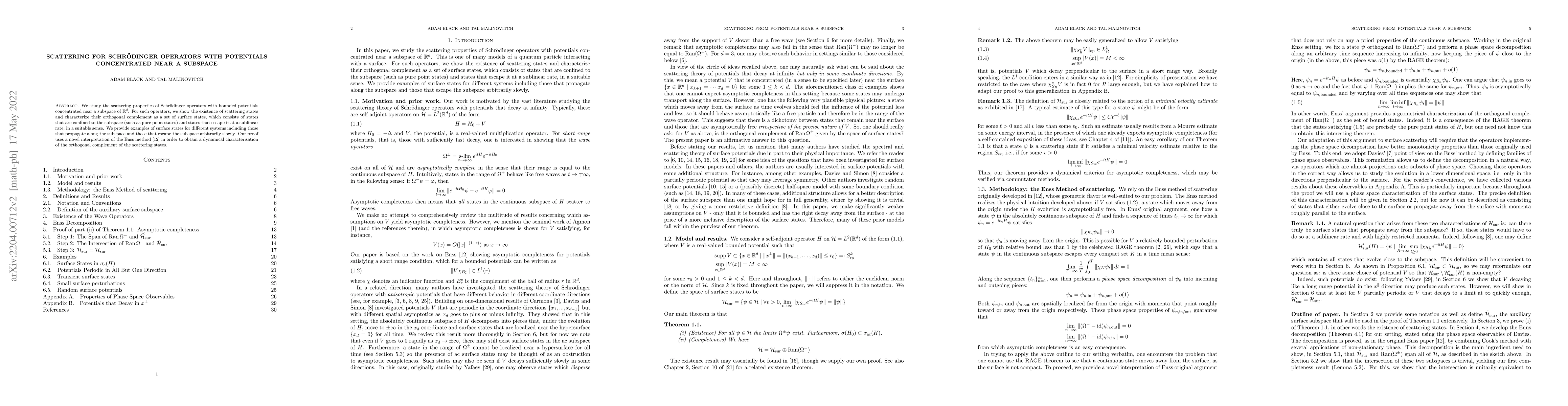 This paper explores the scattering behavior of Schrödinger operators with potentials focused near a subspace in $\mathbb{R}^d$, demonstrating the existence of scattering states and identifying their orthogonal complement as surface states. The surface states are characterized as either confined to the subspace or escaping it sublinearly, with examples provided for various systems.