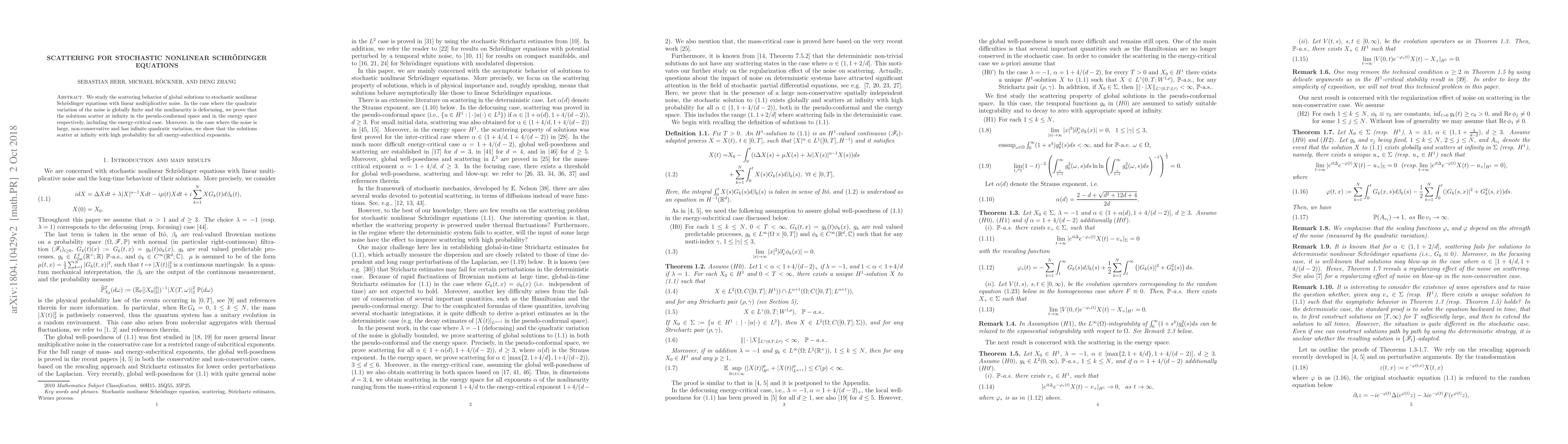 We study the scattering behavior of global solutions to stochastic nonlinear Schr\"odinger equations with linear multiplicative noise. In the case where the quadratic variation of the noise is globally finite and the nonlinearity is defocusing,we prove that the solutions scatter at infinity in the pseudo-conformal space and in the energy space respectively, including the energy-critical case. Moreover, in the case where the noise is large, non-conservative and has infinite quadratic variation, we show that the solutions scatter at infinity with high probability for all energy-subcritical exponents.